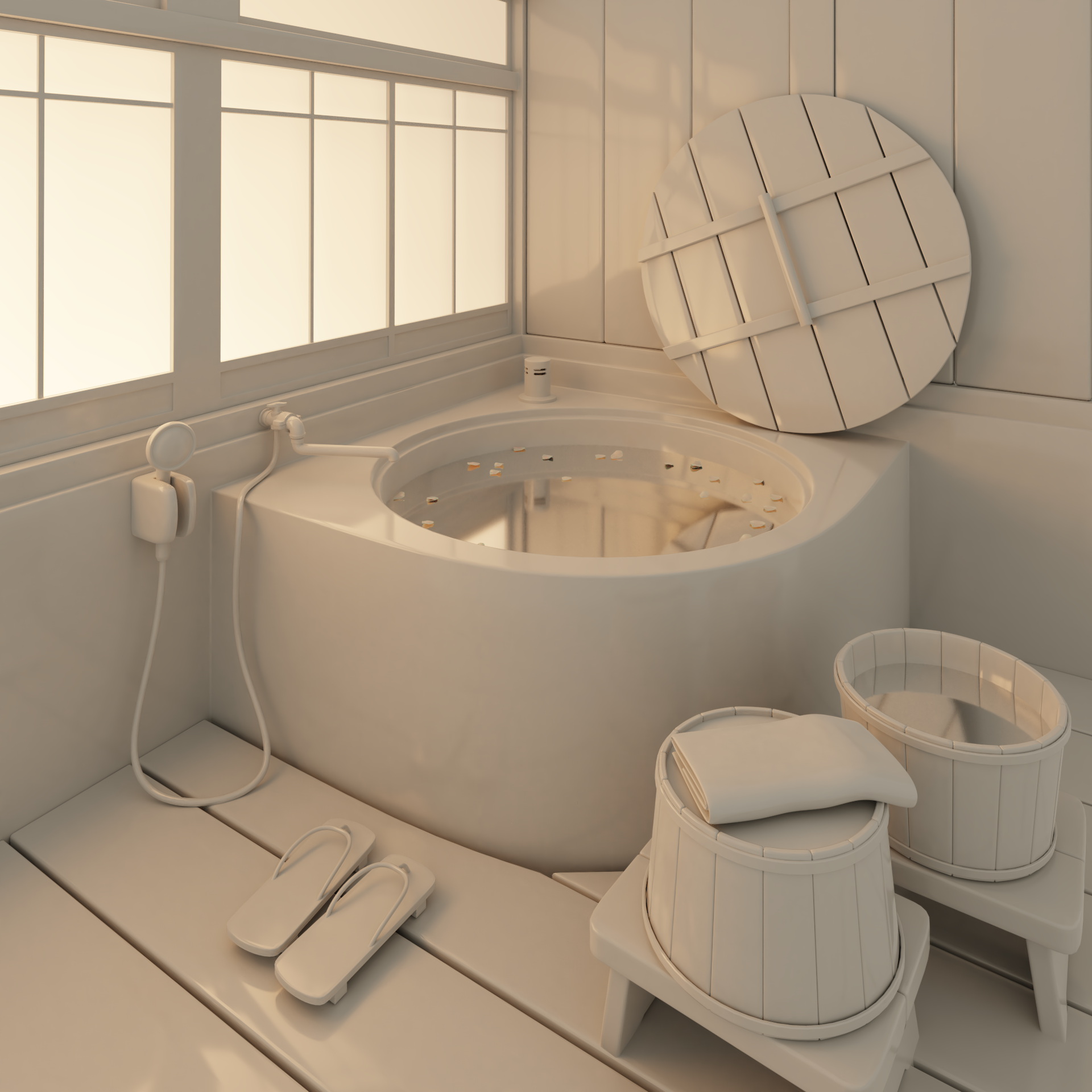 Just finished modelling for the archviz scene. I'm aiming at some sort of traditional japanese bathroom. I'm recreating this scene from a reference image