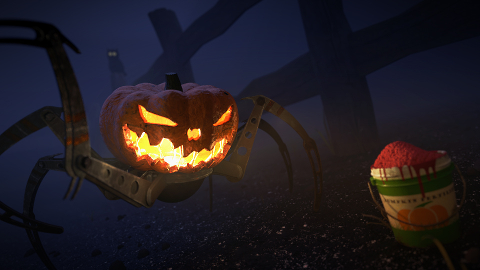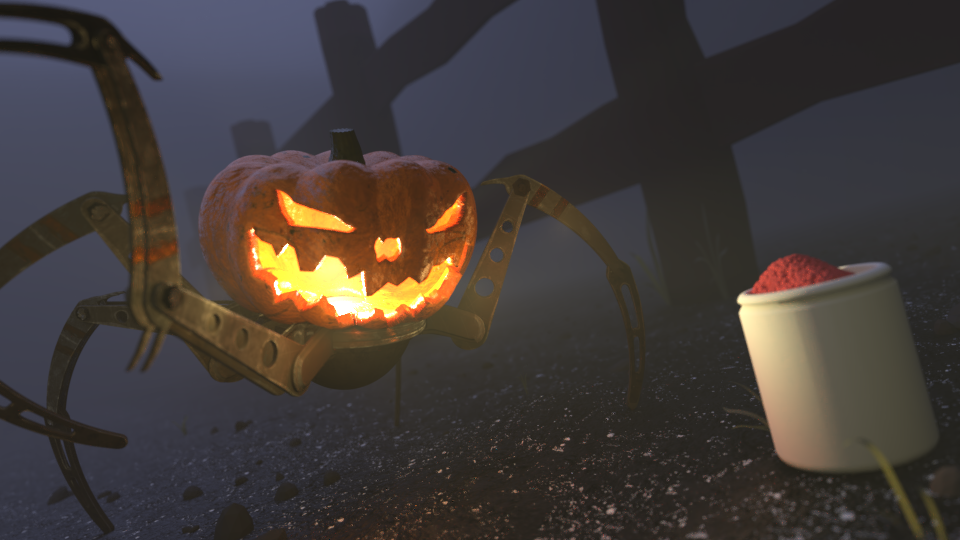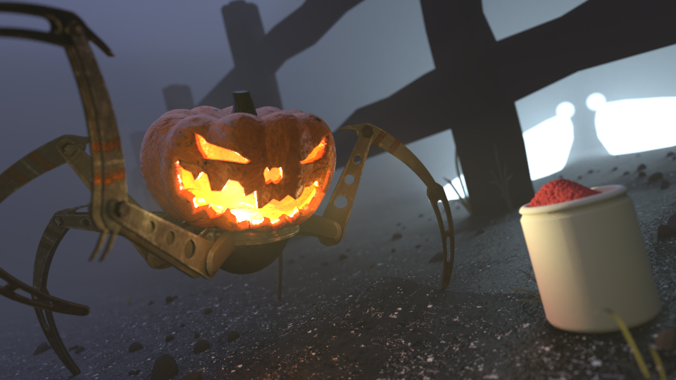I edited the shader of the pumpkin, unwrapped and shaded the mechanical part, set a mist, added particles on the ground this (still needs to be textured), some grass was added manually as well.