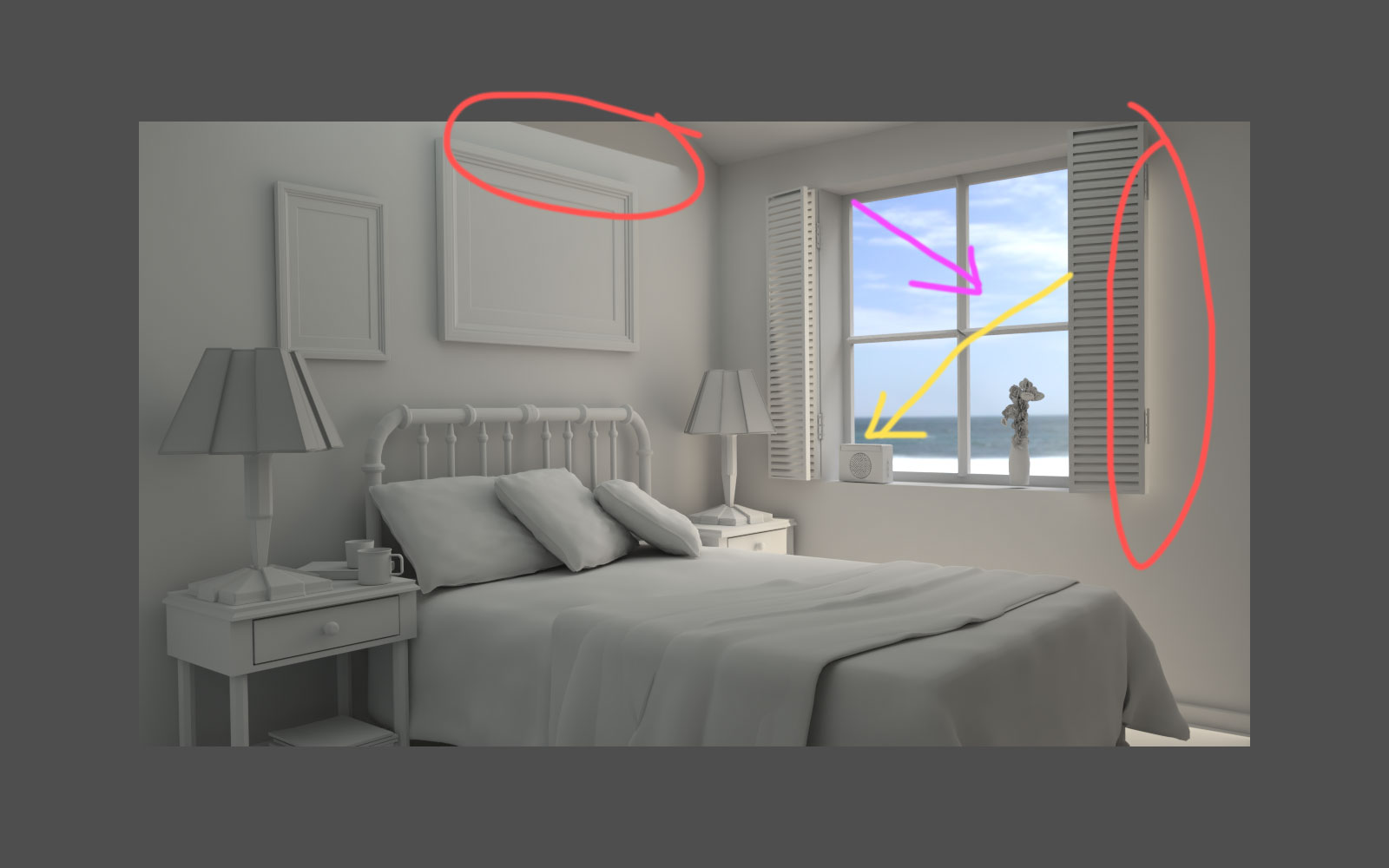 On the upper side, I circled evidence of an area light toward the ceiling pointed downward. Seeing this evidence hurts the believability of the render. On the right side theres a noticeable glow behind the shutter. My guess is that this is coming from a lamp serving as sunlight from the direction of the purple arrow. The odd thing is that environment texture seen in the window suggest a sunlight source coming from the direction of the yellow arrow.