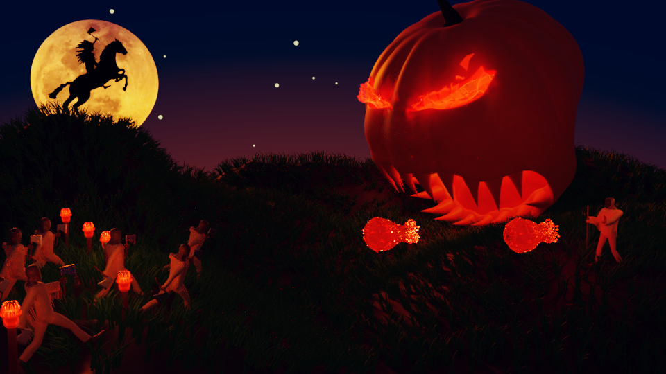 There's an Indian sorcerer who has been ran out of the village. The village is behind a hill. The sorcerer ponders up the demonic pumpkin to destroy the village. On top of the hill is the chief of the village, with his sphere pointed to the air telling the tribe to attack. The sorcerer is behind the giant pumpkin pointing towards the village. The Indians from the tribe are charging at the pumpkin with their spheres and shooting their arrows at it with their bows. I'm going to dupe the Indians, and have them in the dark. The chief will have a black texture, so you only see his silhouette. This will be happening under a blood moon. I'll probably make the Indians be out of focus and have the focus be on the pumpkin. Do you think there's a way I can improve the scenario?
