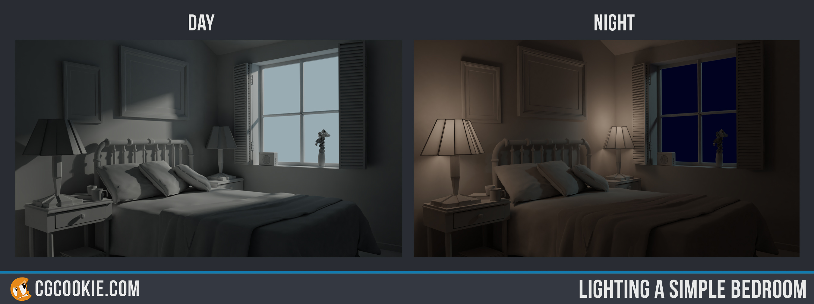 For Day: I used a light blue  area pointing into the window.  I also added a low power light orange area light inside room aimed at the bed.