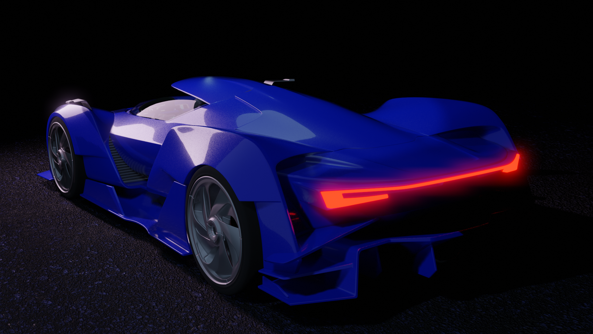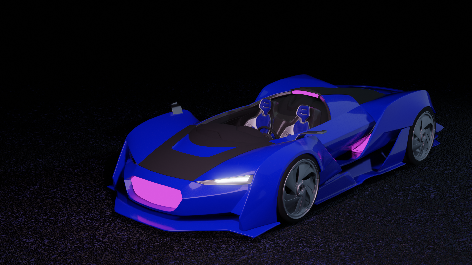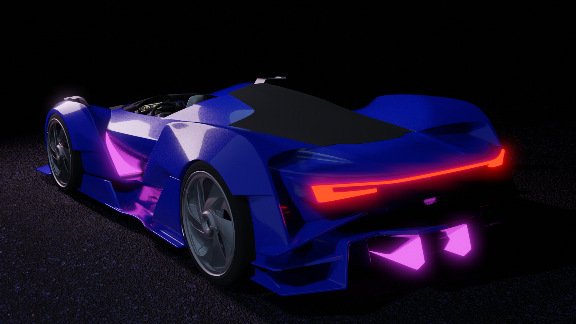 The car looks like a good start to what could be something great.  The matte black looks a little strange, not quite sure what it is, the magenta lights at first thought looked like the texture you were sourcing is "lost" or broken in some way, but I think you just wanted magenta lights.  I don't know if I like them with the blue personally.  The background is maybe not the best color since you do have elements of black in the vehicle.  It's a good attempt nonetheless.