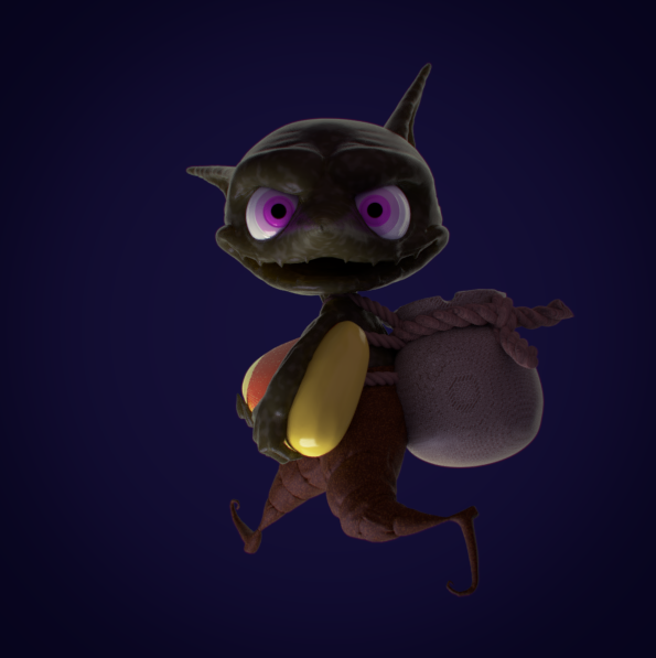 • Character looks cut and pasted over the background: I'd like to see more interaction between the character and the background. Rendering them together is the best way to do this. Right now it looks like you lit+rendered the goblin separately and composited it over a background color.