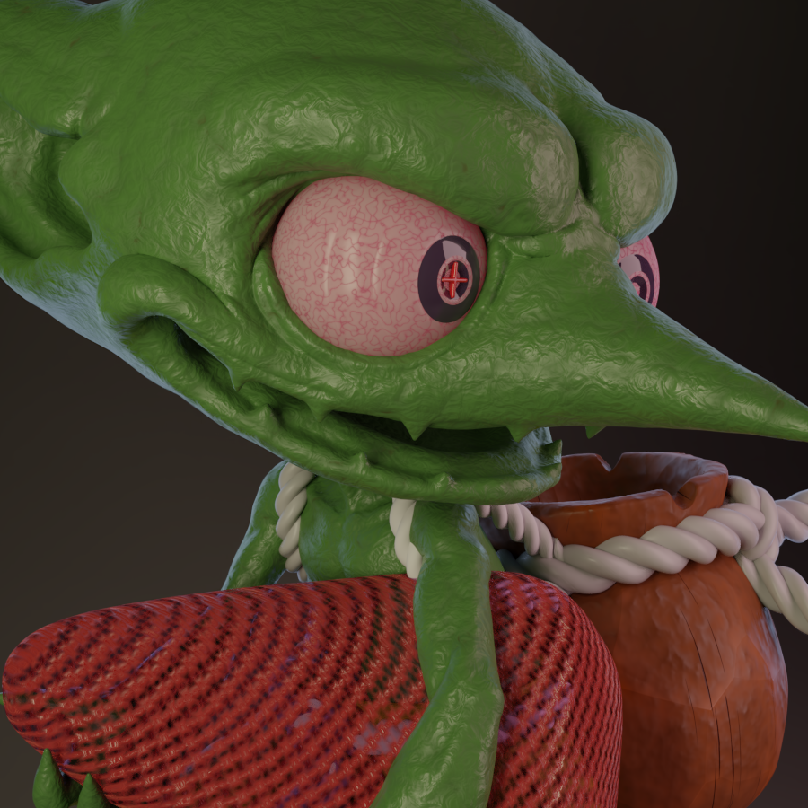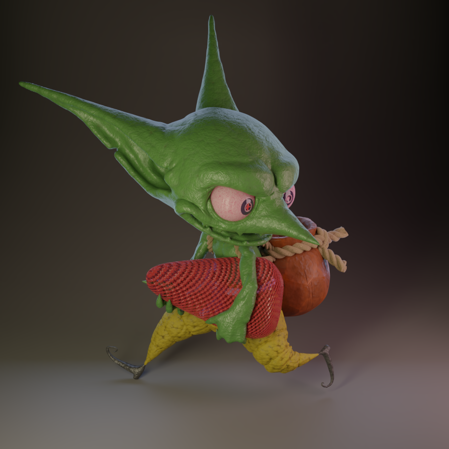 Your character lighting looks pretty good though the quality is overshadowed for me by random procedural textures. The red fabric candy corn, the yellow blobby pants, and the orangy iron-ish back pouch. The green skin and eye veins make the most sense, but overall the character feels more like a material experiment than an intentional character render. That's not to suggest you haven't worked hard on playing with these various procedural textures! I know that's a lot of work and a tricky endeavor. But right now it's a little to random as a *character* render.