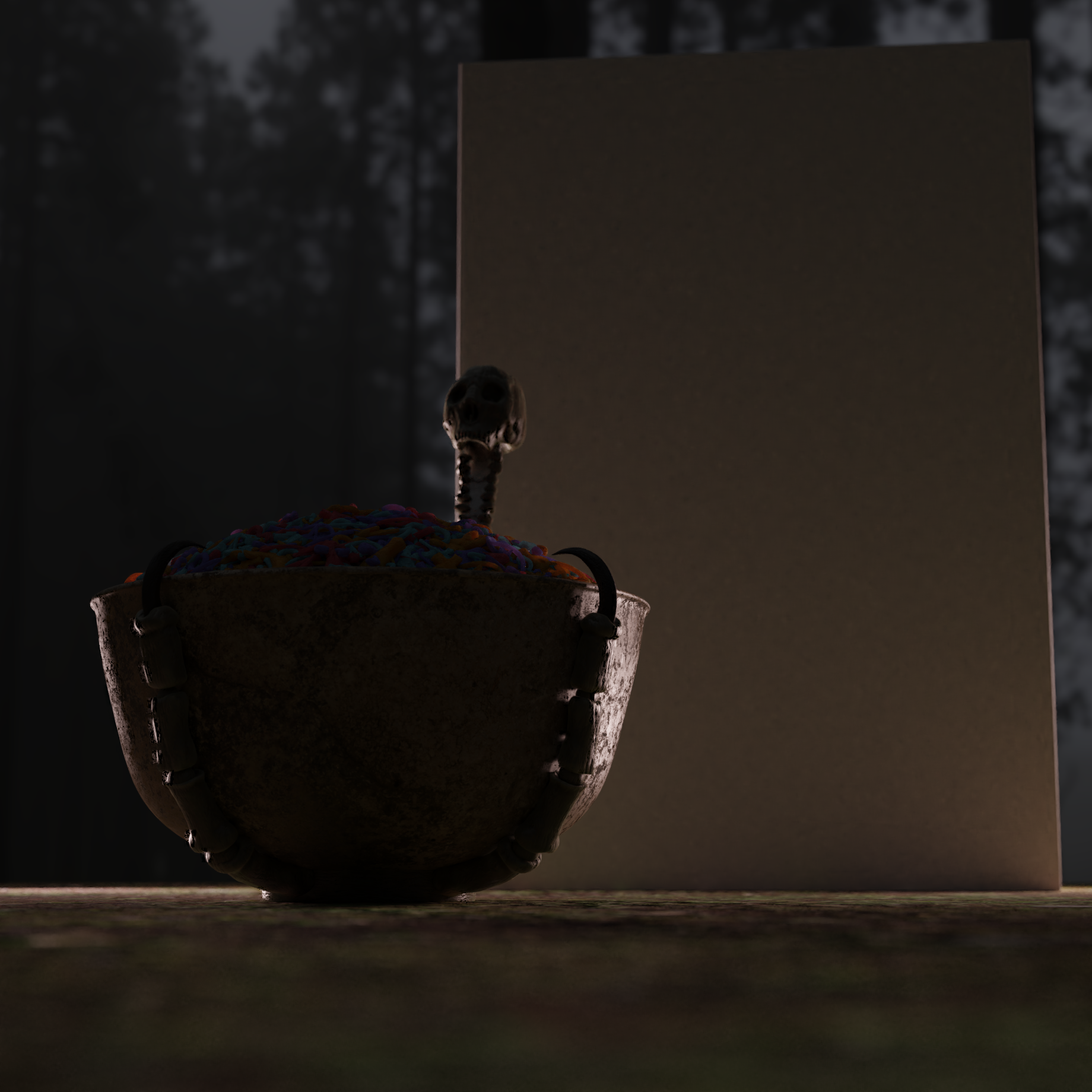thecabbagedetective Getting there! For more symbols, what else represents the devil/satanic things? Might be able to find a list somewhere. I think ravens are symbolic for similar ideas, so you could throw that in, too. As for the cereal shader, you'll have to be the judge on how detailed they need to be. Heck, go find some cereal and take a look for reference. I'm not sure what varieties you have in England, but I'd reference something like Fruit Loops or similar.