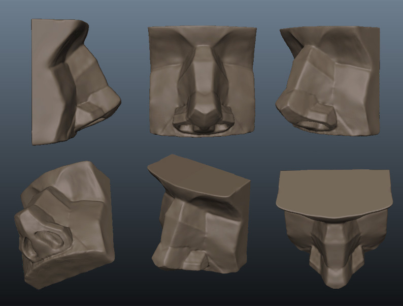 Learning sculpting brushes in 3d or pencils in 2d is not important, see through it, learn the nose! :) Most 'complex' features are actually pretty simple once you learn to see them like this. And.. another important lesson is that sharp edges or holes are relatively rare on the face (or the human body in general). This is really great! Because, if you nail the planar representation (its actually pretty hard when learning so don't be discouraged), all you have to do is soften/smooth a little and then 're-add' the few hard creases, wrinkles, ledges or accents. Turning it into a 'real' nose is actually the easiest part!