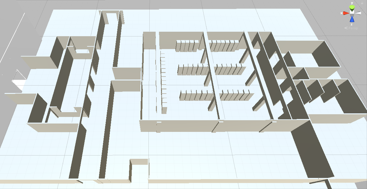 First stage was whiteboxing a level inside unity with a couple of prefabs representing doors, walls with a scale of 1 unit in unity = 1m