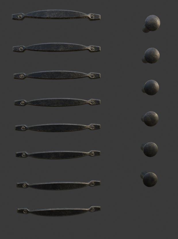I have also prepared material for handles. I decided to model more of them to have some variety between them and not just one copy for all handles.