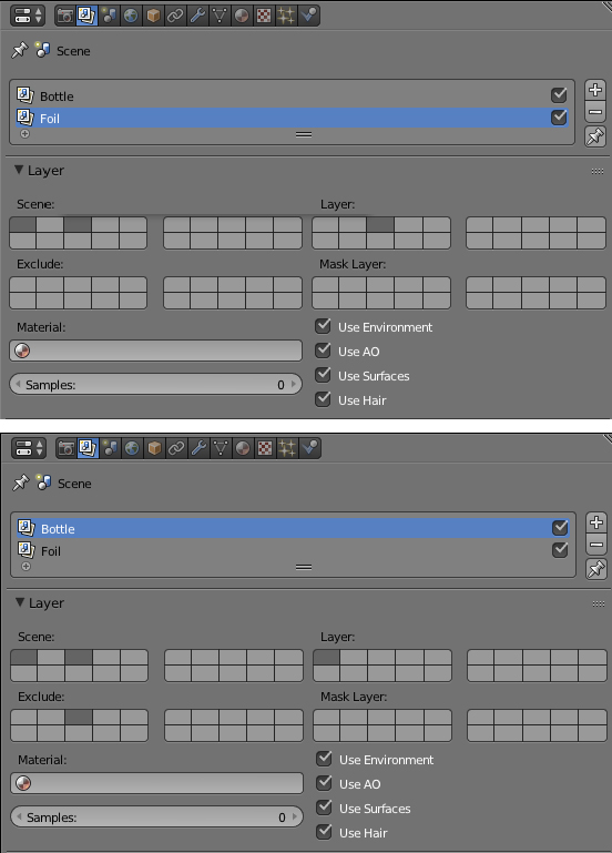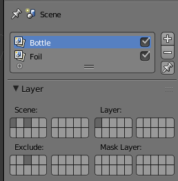 In the Scene tab I set the Bottle "Layer" button to square 1 and the Foil button to square 3 (Pic attached)