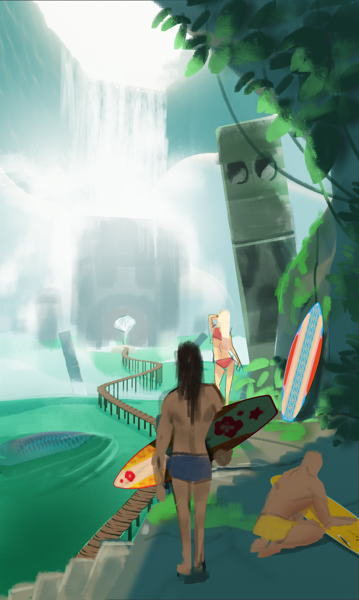 I always intended to put some cool surfer dudes 'n gals into my scene. I figure the backstory is that while out riding some gnarly summer waves they accidentally discovered some ancient lost ruins. With some of these details added in I'm getting a clearer picture of what props I need to make.