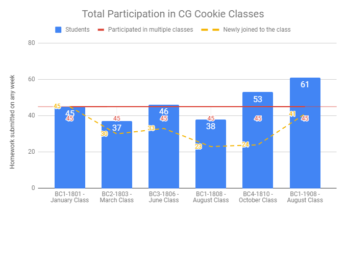 Plus -> Per the historical statistics 196 students participated in the 6 CG Cookie Classes, from them 45 ones multiple times (red line on the below chart). That almost 25% could be considered as potential core, which is quite a lot of people