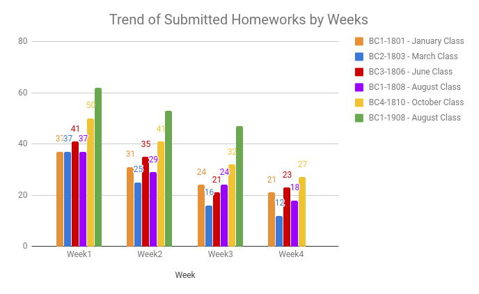 Commitment: One of my favorite characteristics of this particular class is its commitment level which proved higher than any class before: 79% of participants that submitted week 1 homework submitted all 3 weeks, beating out the former highest percentage of 65%. That's nuts especially considering this month also had the highest homework submission volume to date. Here's to perseverance!👏
