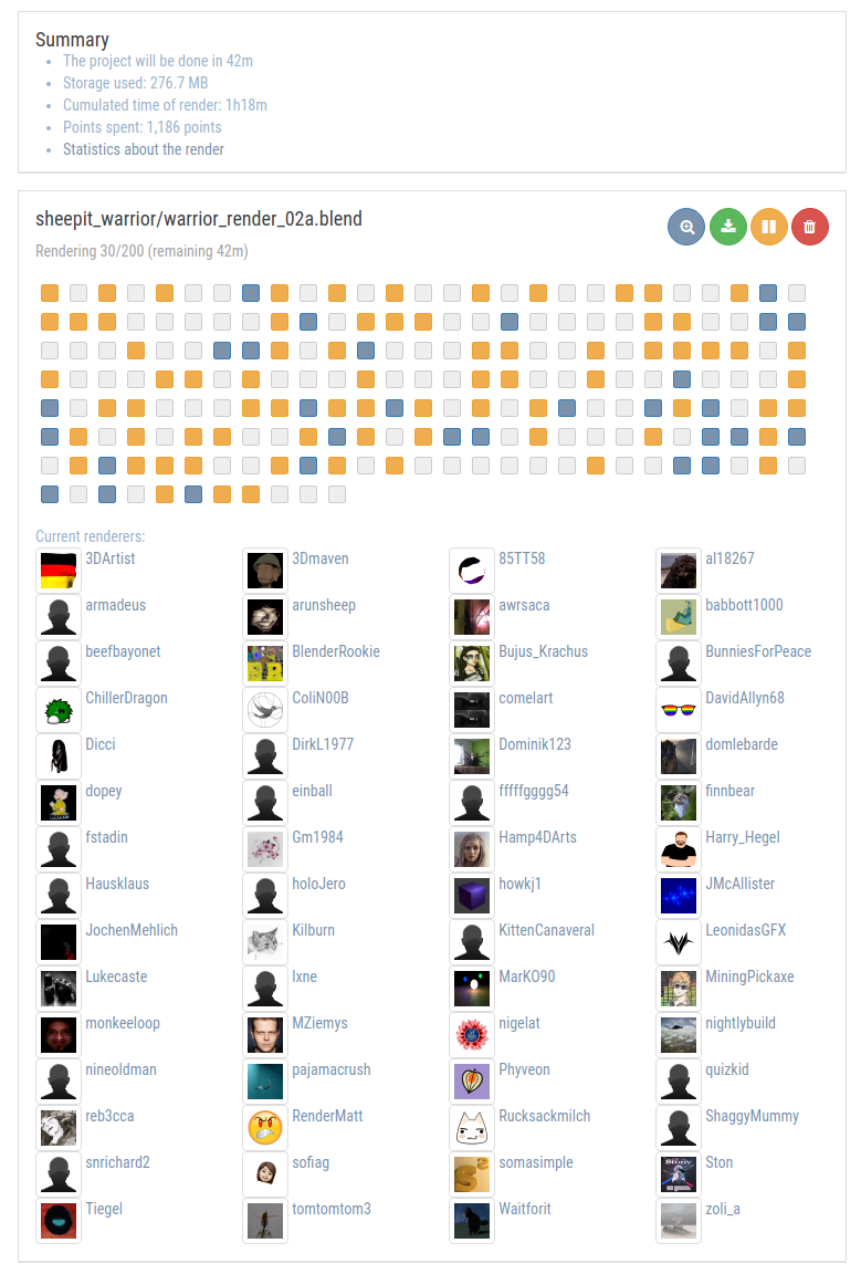 So there's incentive to gain and maintain points. I submitted a single-frame project (split into 32 tiles) when I had about 60-70K points and it waited 2-3 hours in the queue before it started to render. Today I submitted a 200-frame animation when I had about 280K points and it started and finished rendering within an hour. Linux Luke would have taken 6+ hours! Check out how many people were rendering my scene at the beginning: (spoiler: 60 people!)