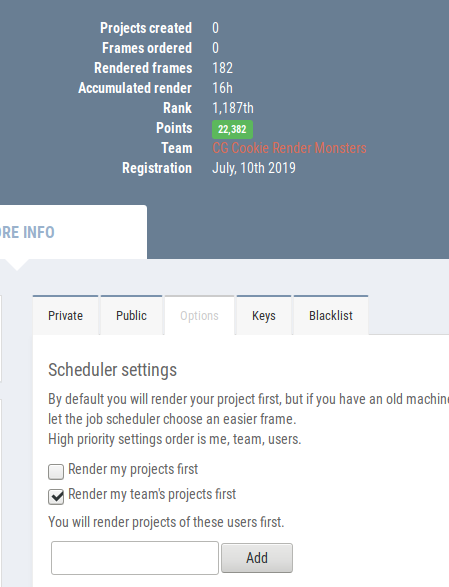 dostovel to submit) a scene file for rendering. If you go to your SheepIt profile page under Options, you can enable "Render my team's projects first" to prioritize them. Then all you have to do is launch the applet on your computer, sign in with your credentials, choose your preferred settings, and SheepIt will do the rest.