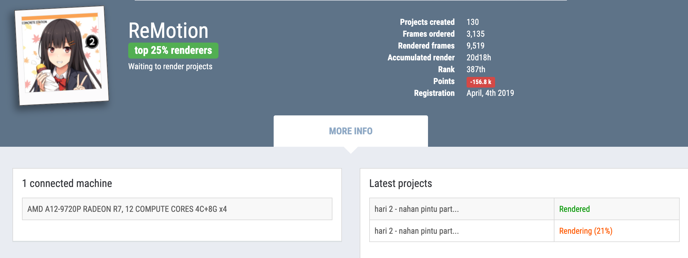 yyukinoh1989 We still haven't submitted one of my scenes to Sheep it for rendering. Firstly, I still have to finish preparing the scenes and I guess secondly because we would need points to render them. For now what we are doing is accumulating points to have as a CG Cookie Team in general, so that any of us who would need it could render something in the future.