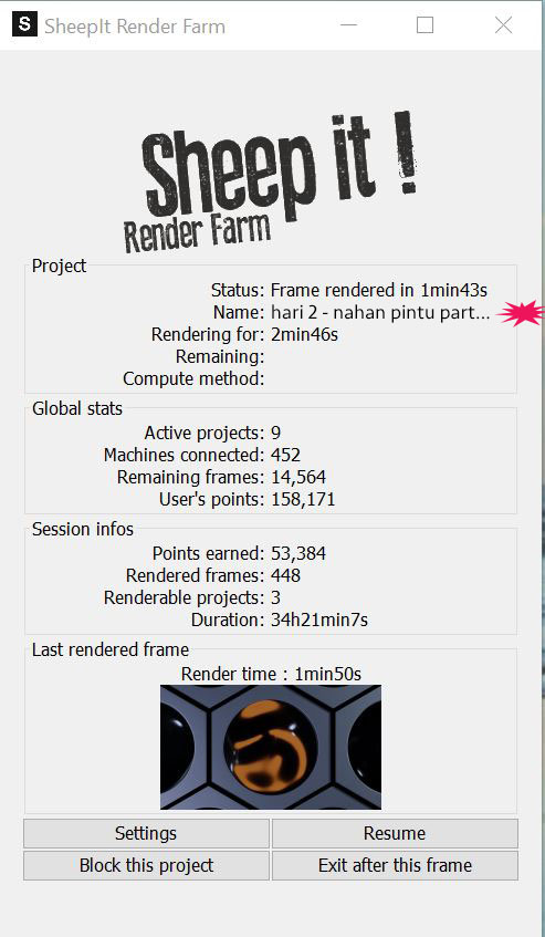 To follow through with my example, below is a photoshopped SheepIt Client example. I have added the "hari 2 - nahan pintu part..." in the name field and put a red burst shape to show you where you would find it. This is only to show where the name of the project can be found in the SheepIt client.