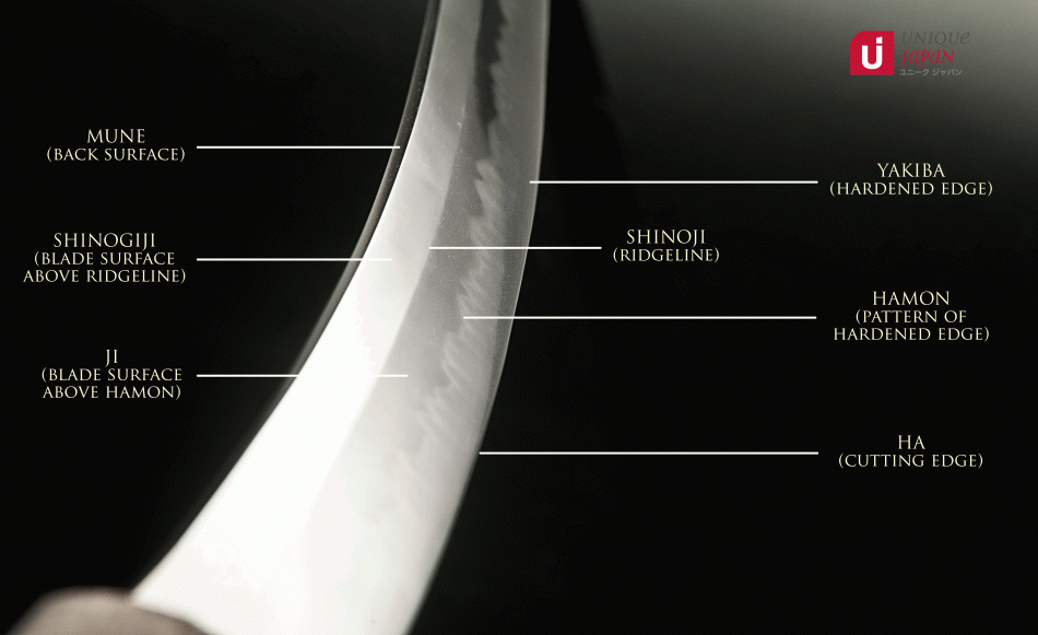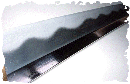 Katana blade specifically have a very nice "temper line" (called Hamon). These come in a large variety of form, size, and can separate two different colors of metal, the cutting edge being a hardened part compared to the rest of the blade.