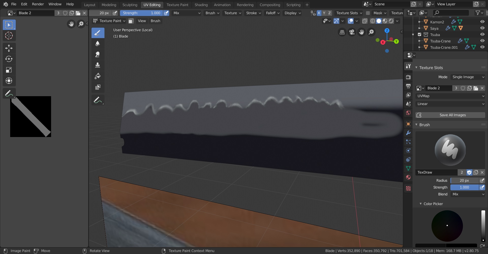 So I simply applied the modifiers to my blade, marked the seam on the cutting edge, UV unwrapped, and started painting to, "just try". This is neither the final shape or what my goal is, but at least I start to have an idea on how it works :