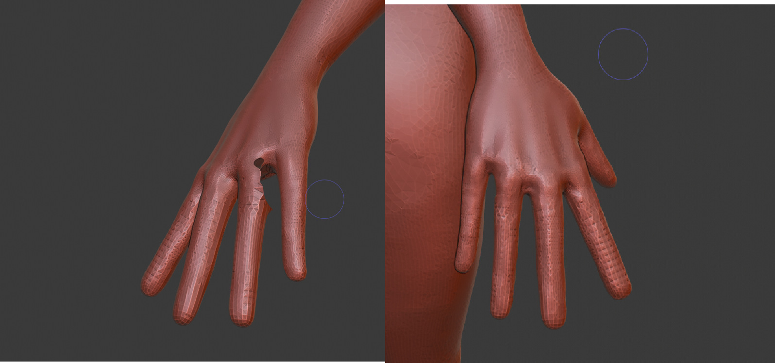 Hi I was sculpt a woman and when I was doing my hands I noticed a difference that was not present in the base mesh.On one of the hands a finger has a hole that can not be changed.