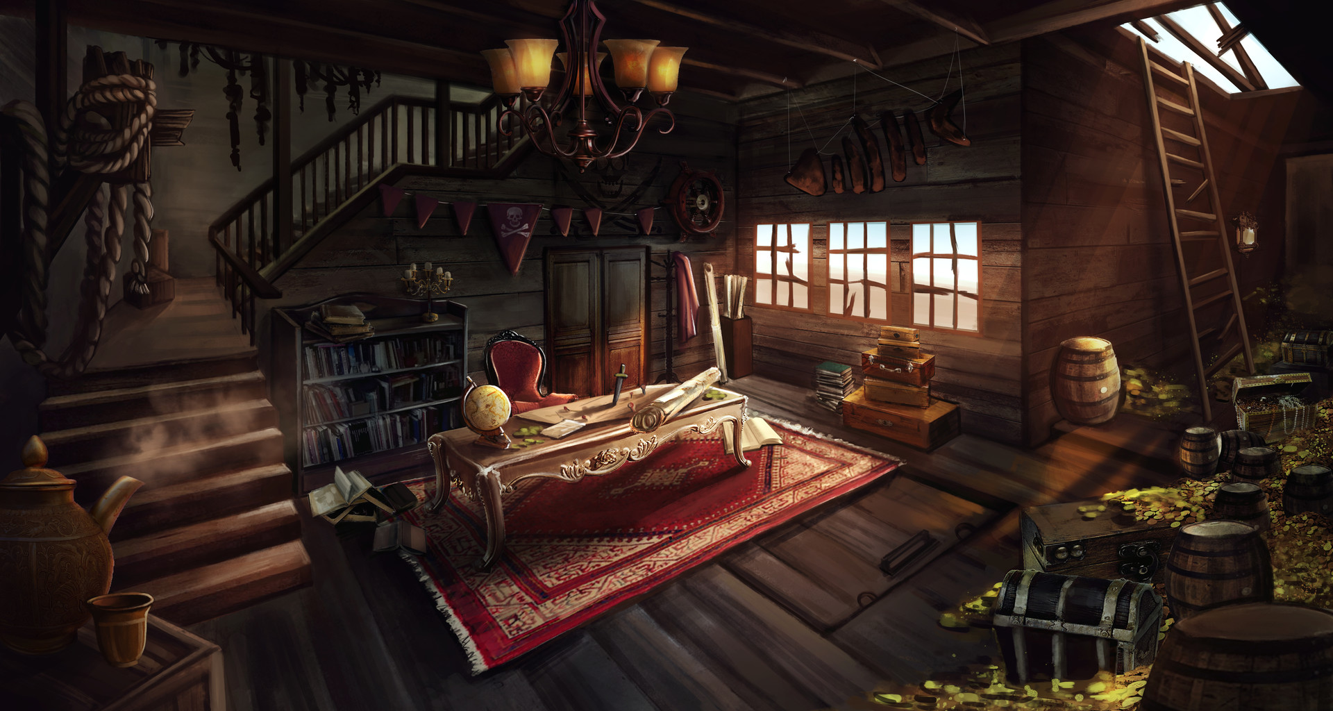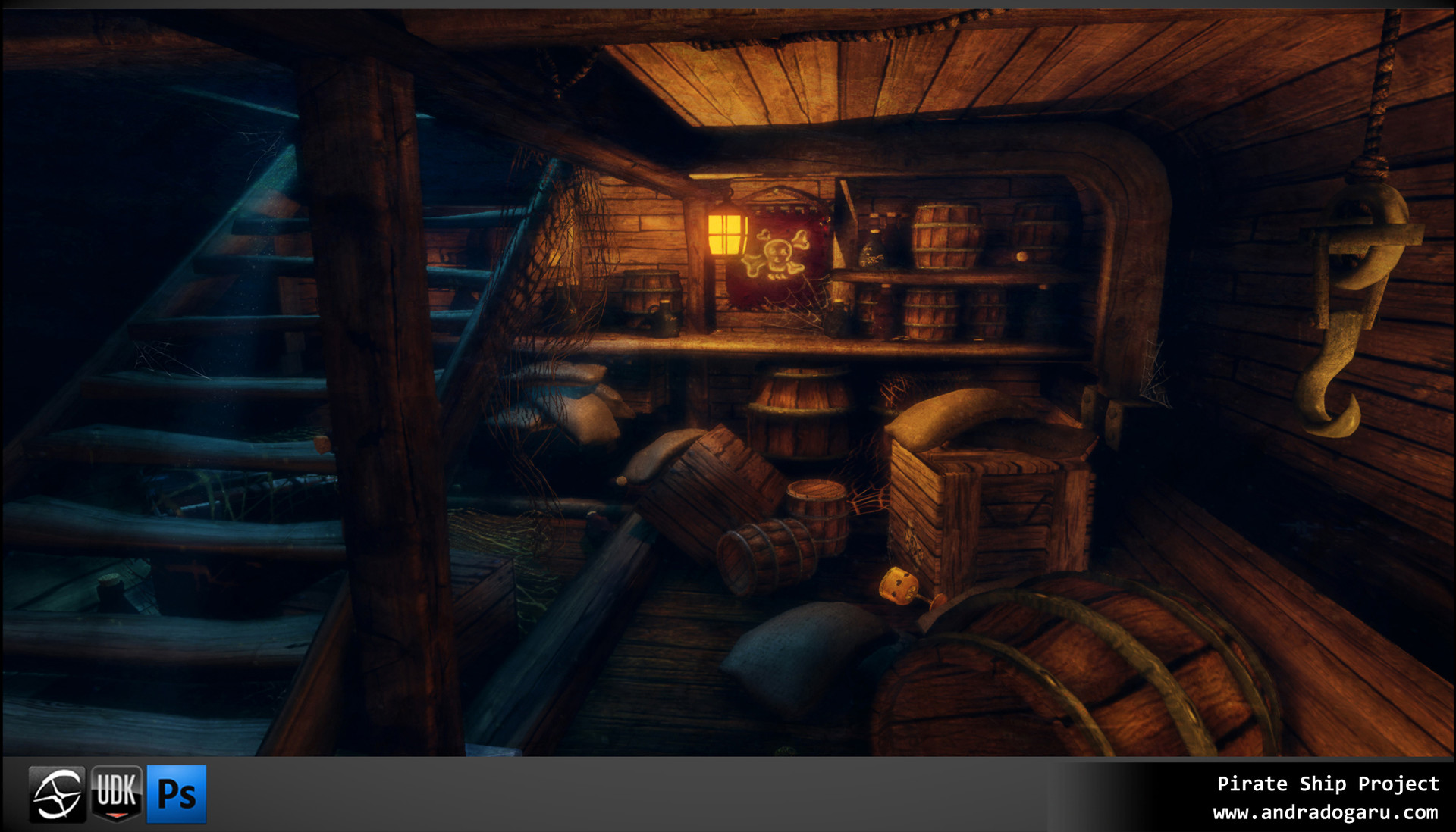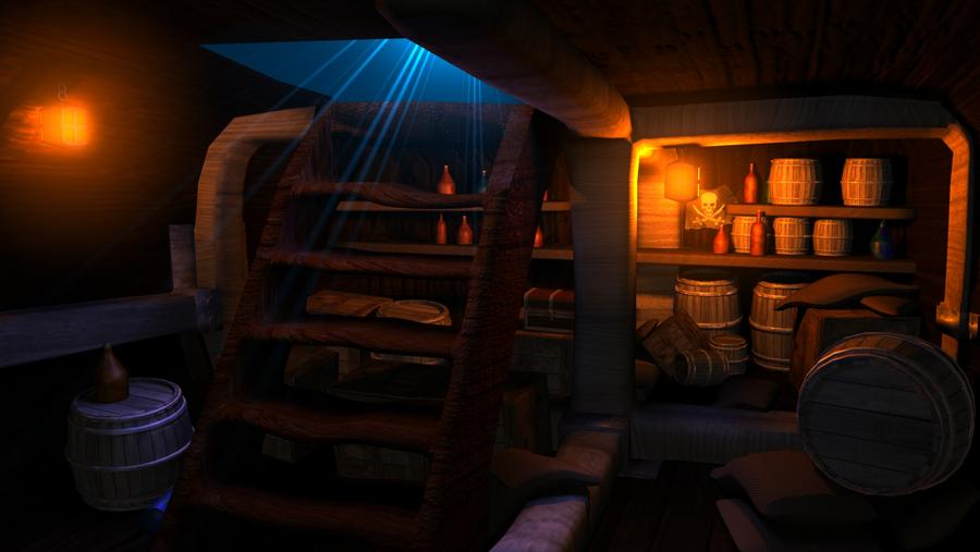 spikeyxxx This is looking really great. The floor looks fantastic. Good decision to repaint. The post and supports look solid. The contrast with the "new"er crates to the weathered floor/walls is good but might be a tad too clean considering the number of grimey hands that had to move them there. The wear on the stairs works well but the color on the railing looks random. Nice color on the metal bands on the barrel. I'm sure you'll clean up that rum/wine/blood when we do materials. Look forward to seeing this finished and lit well. Nice job.