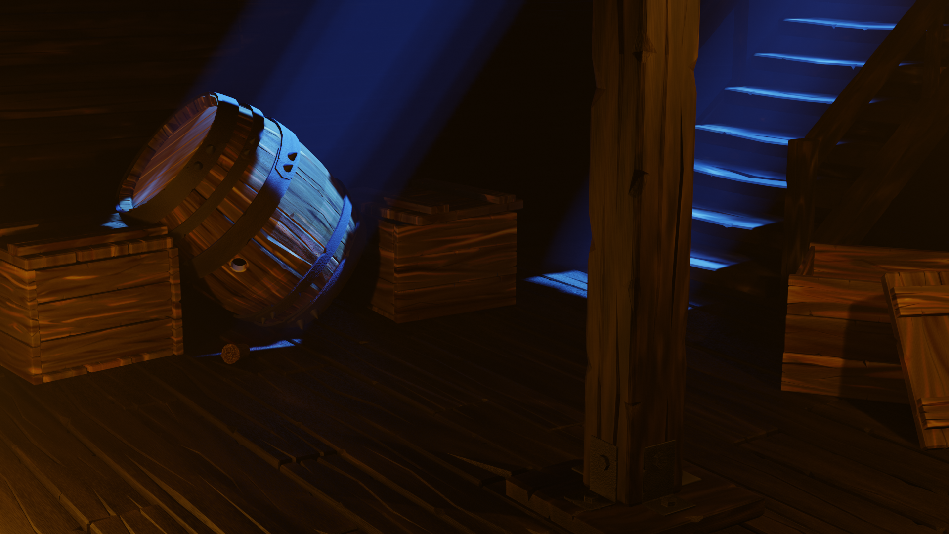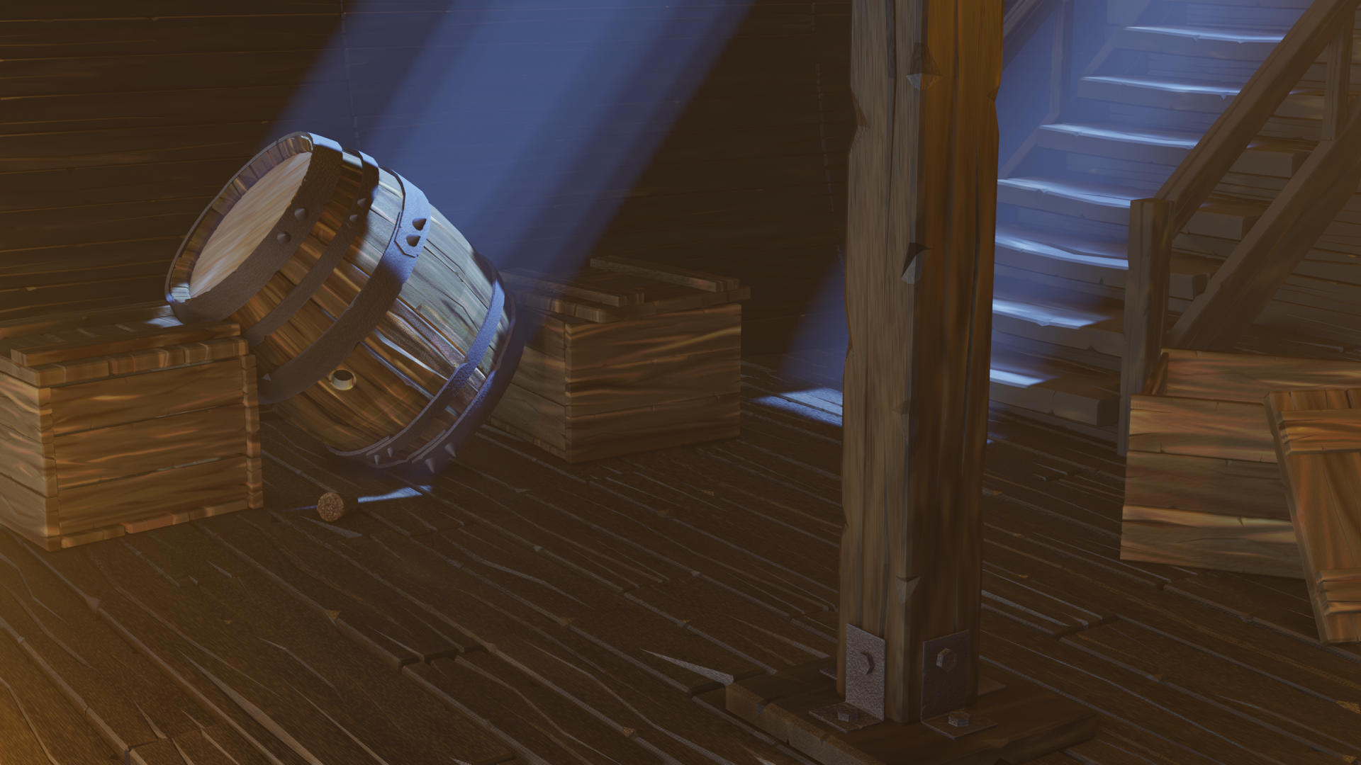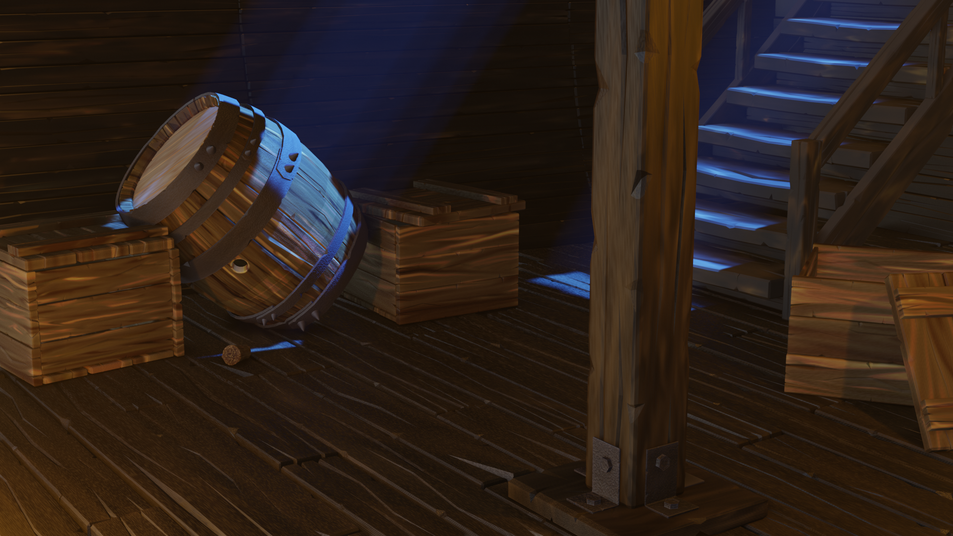 I like to see the evolution of the wood textures. You listened to good suggestions and applied accordingly. I really like that the floor, crates, and wall/stair boards have unique wood types. The major challenge I see before you is how to avoid all the wood blending together.