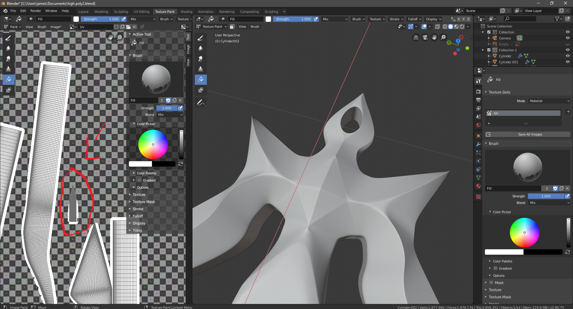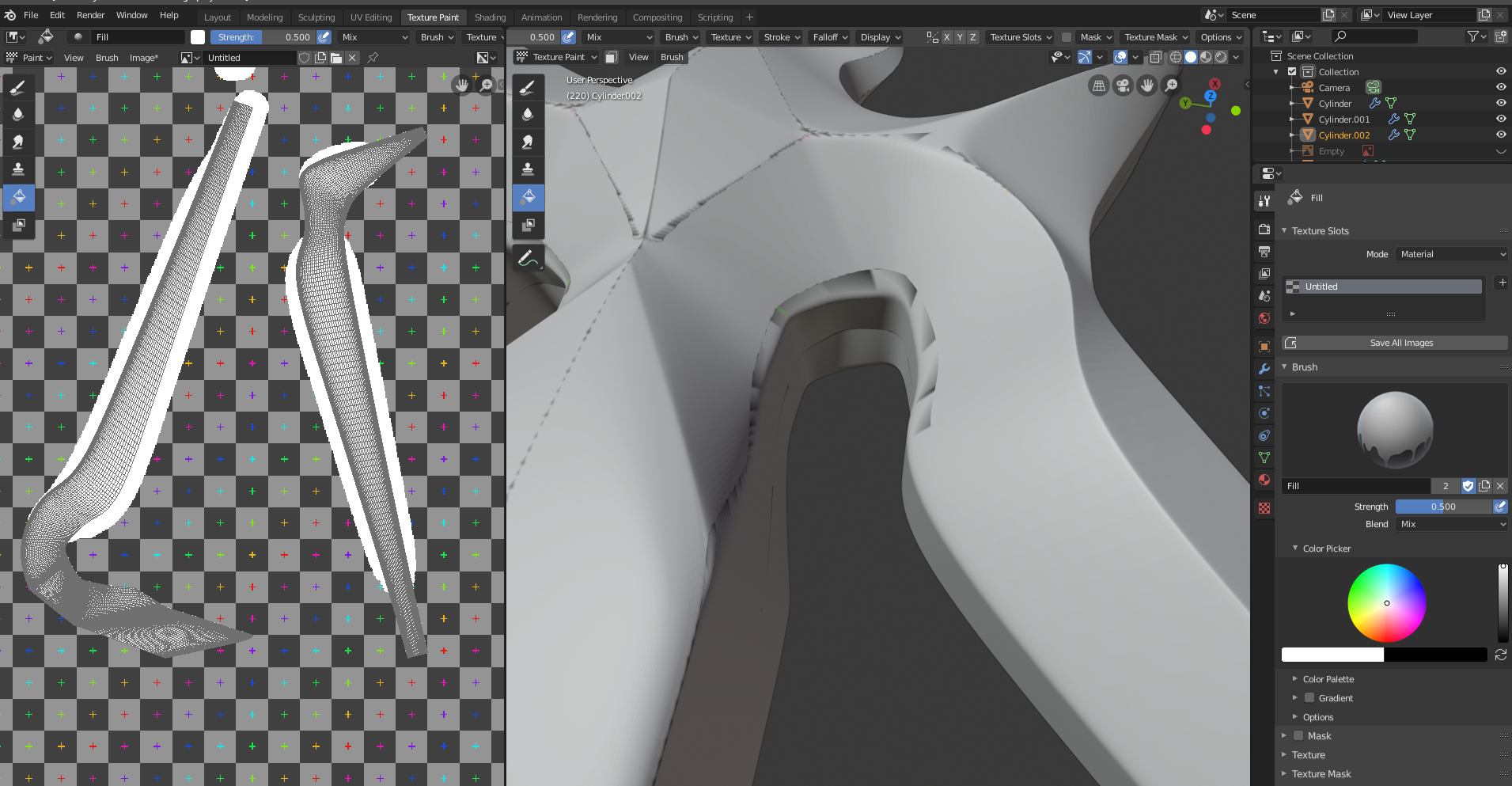 I've seen that "diamond gradient" pattern before with the fill brush. Usually happens whenever I try to fill from an orthographic perspective where faces overlap in the view axis. This actually happened briefly in the stream on Tuesday where I painted with occlusion and backgace culling disabled from front orthographic, resulting in that diamond gradient pattern.