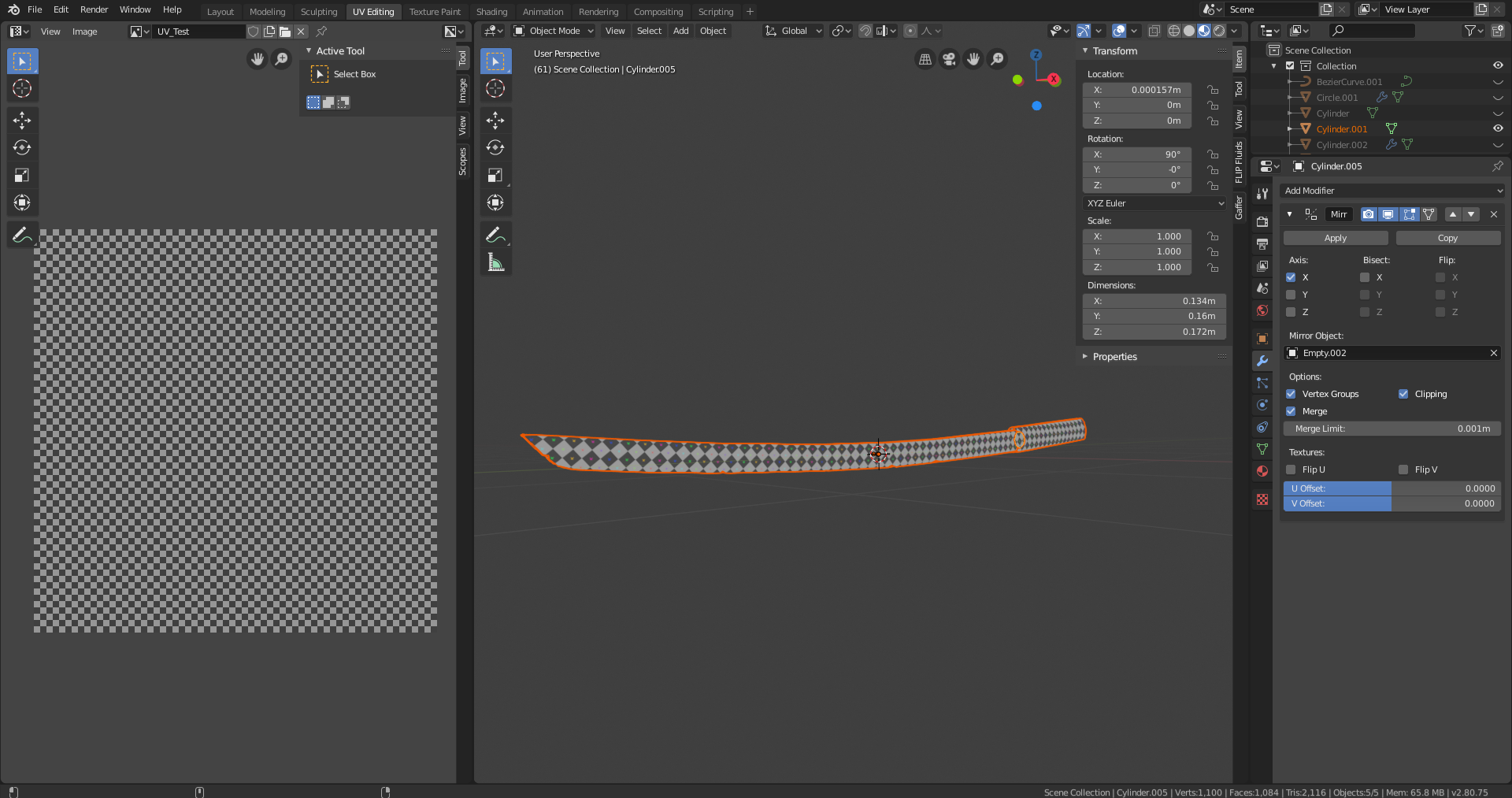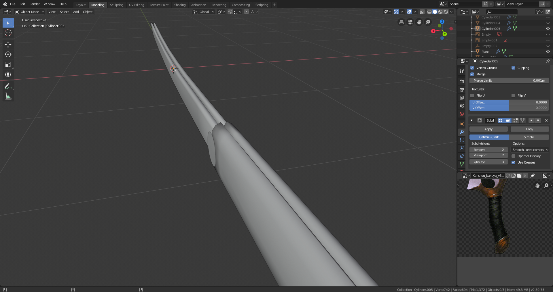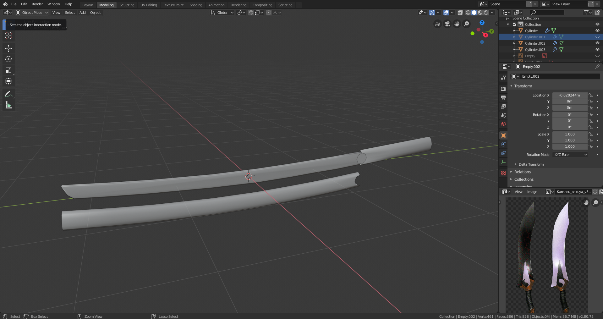 At first, I created a single pommel and then flattened one side of it to get the flat look I wanted. I then used the mirror modifier to create a second one that would appear as if they were together. I also did something similar with the blade but I used the pommel as the mirror object so that the blades would always be in the middle. I also added the Ying-Yang circle on the very end of the pommel to take more inspiration from the twin swords