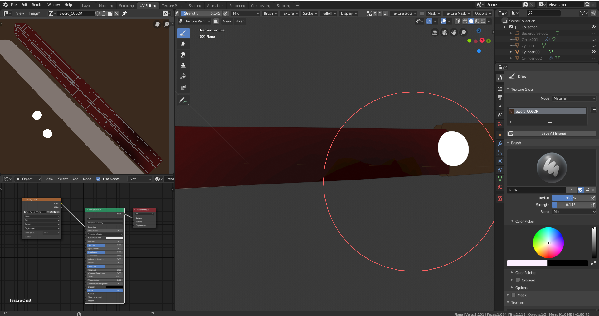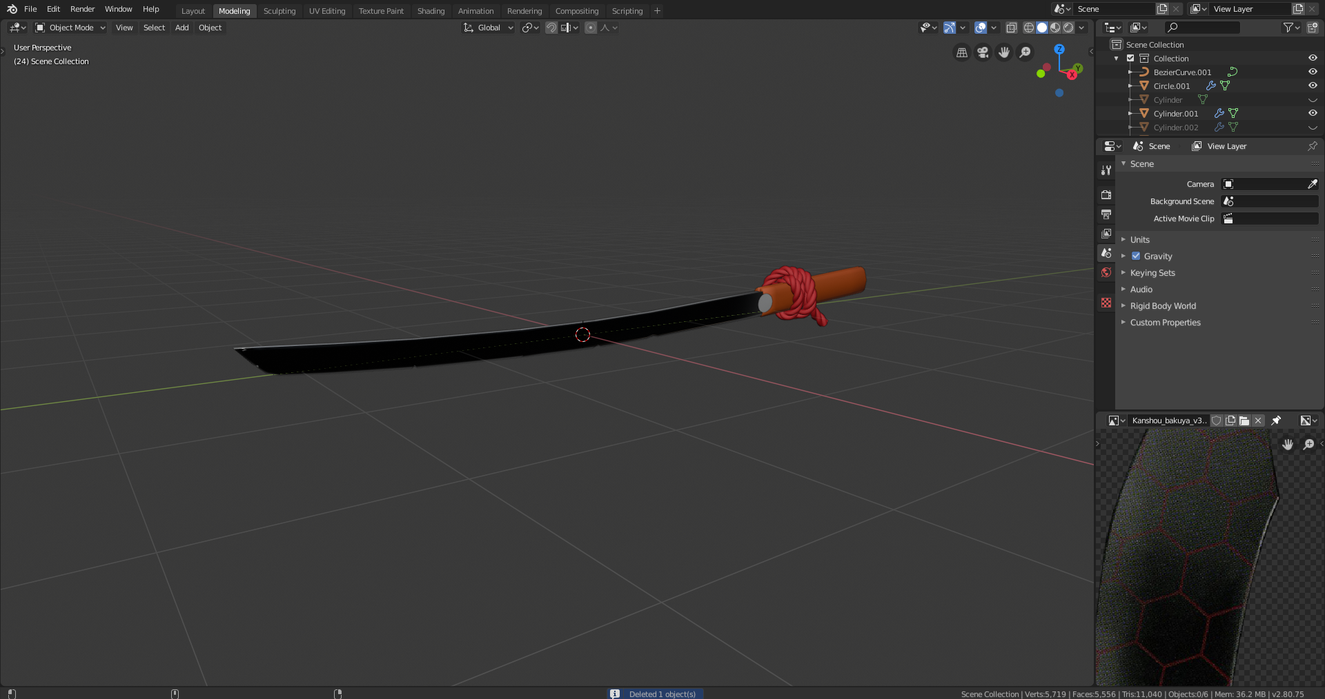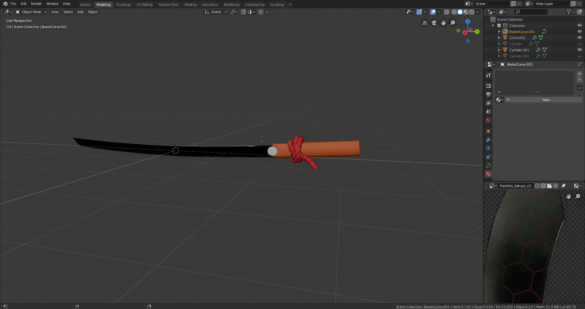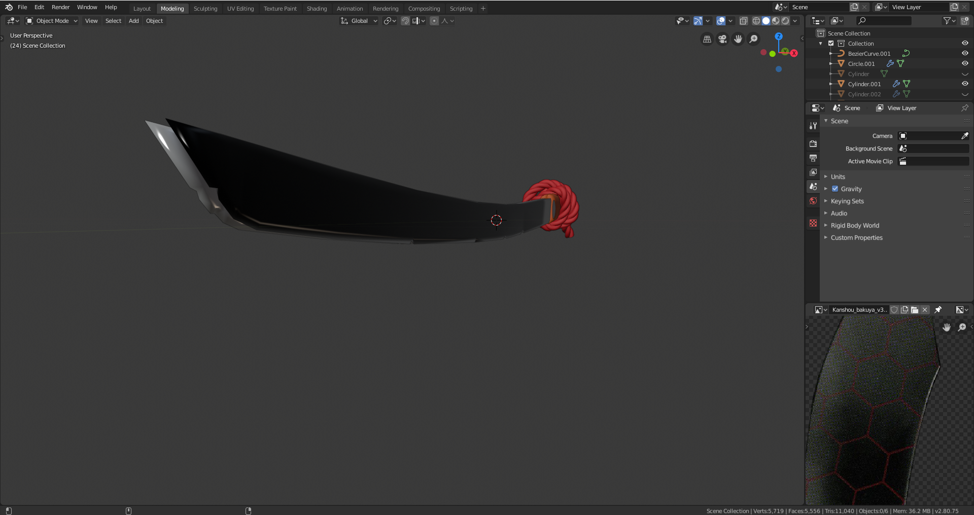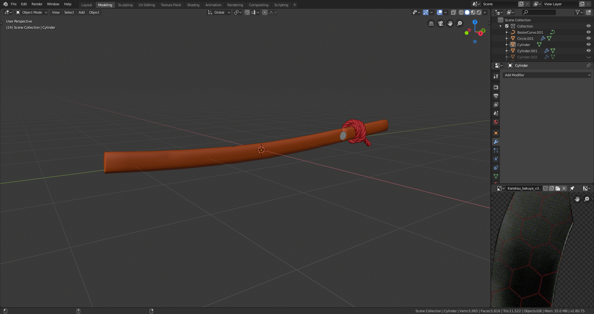 Still making some last-minute design choices to the swords. At first, I wanted to put a cloth around the handle of the sword but that proved to be too difficult for me so I decided to make a rope tied around it instead, using the screw and curve modifiers. I wanted to add the hexagonal pattern in the black sword onto the model but is it better to make another model and use snapping or the shrinkwrap modifier to project it onto the blade or would it be better to apply it as a texture?