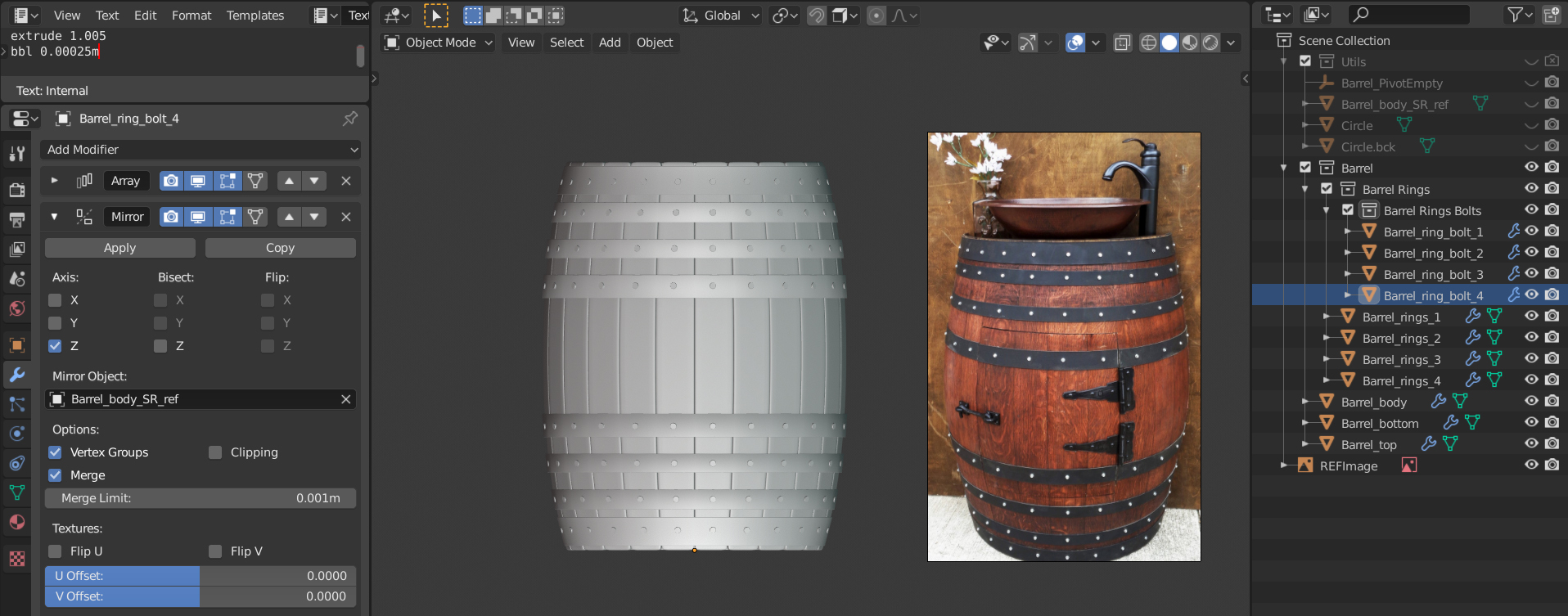 Only thing I might have done a little different is to use the data sharing approach like in the treasure chest course. Instead of an array, I'd find the value needed for duplicating and rotating my planks around barrel diameter (360 divided by the # of cylinder segments). Then I'd model unique wear and tear details into probably 4 planks. Finally I'd randomly duplicate the planks around the barrel diameter.