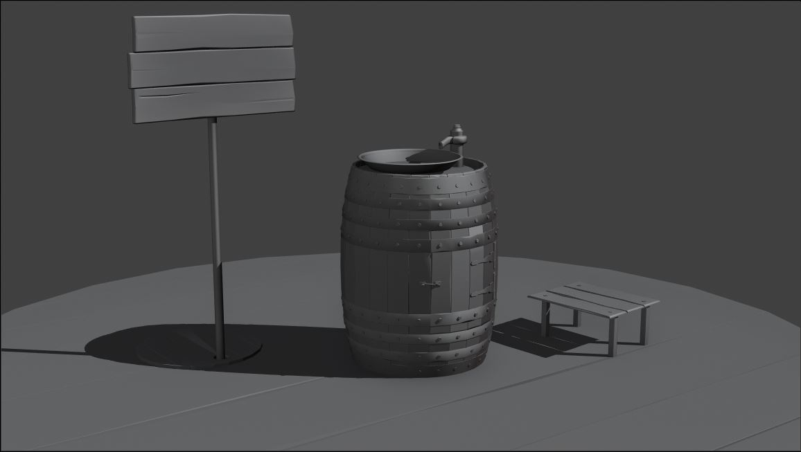 avirozenboim Hi, and welcome!  Good effort on this scene!  I like the door in the barrel.  Kind of reminds me of one of those "hidden bars" sort of things.  The wood slats could maybe use some more detail in the middle to help break up the overall smoothness, but that's up to you on how stylized you would like to go.  Keep going!
