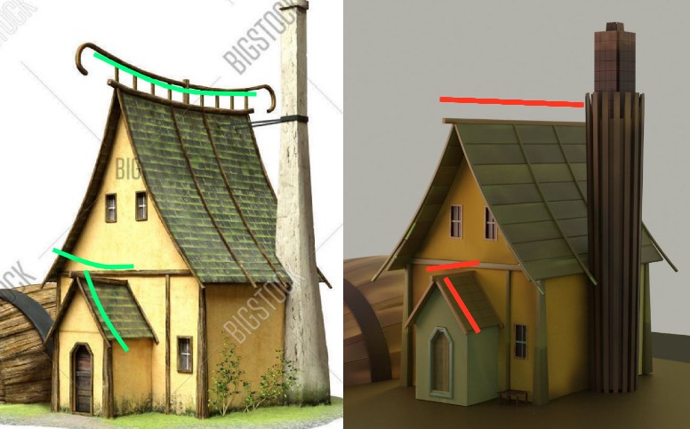 As for the texture, my primary criticism is a lack of detail. If these are meant to be dwellings that humans/hobbits/elves/etc then the model and textures need to have enough detail to support the scale. Currently with the textures being more broad and less detailed, they look like miniatures. The art has a lot more fine detail like wood splits, roof tiles, and moss/grime at the base near the ground.