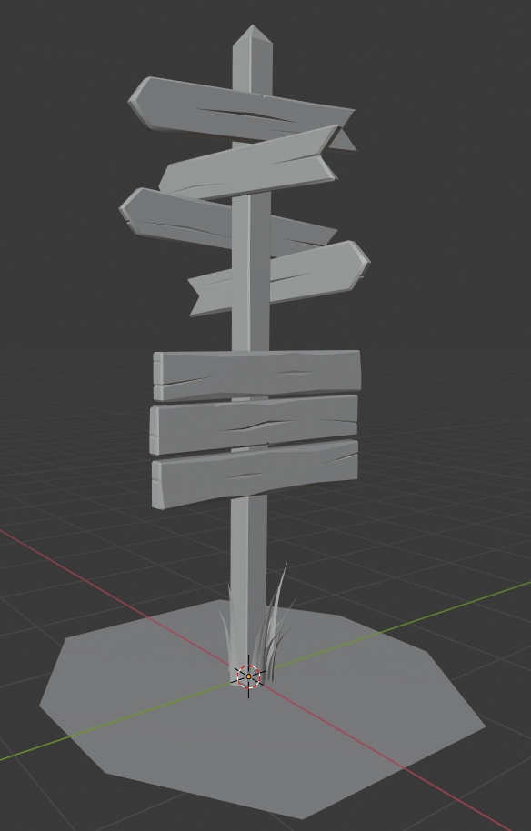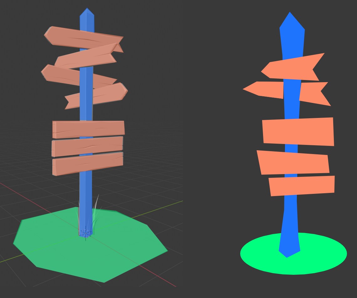 However one principle isn't quit as present. In the last video I opted to add a lattice modifier to eliminate the over-abundance of straight edges in the treasure chest. In the same way I recommend "un straightening" the post and sign planks for more exaggerated proportions. It should really hammer home the fun-loving lo-poly style. Hopefully this image is helpful: