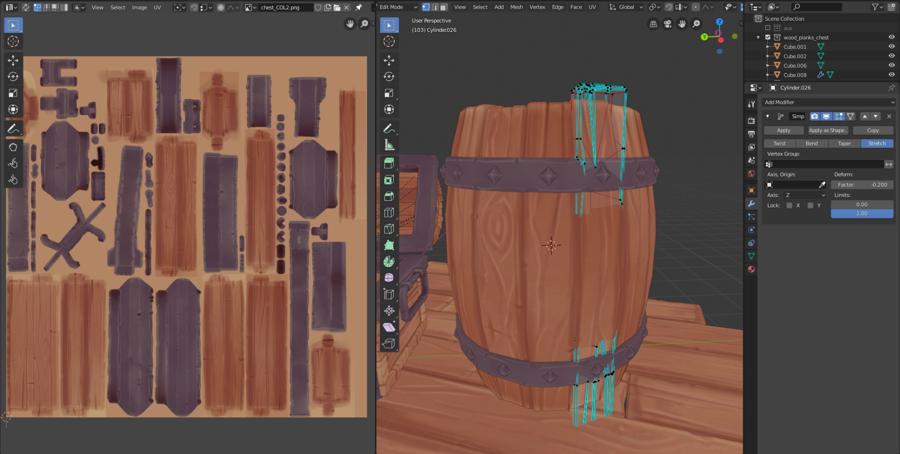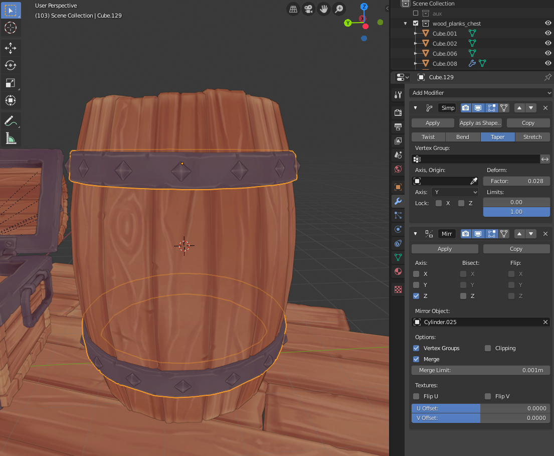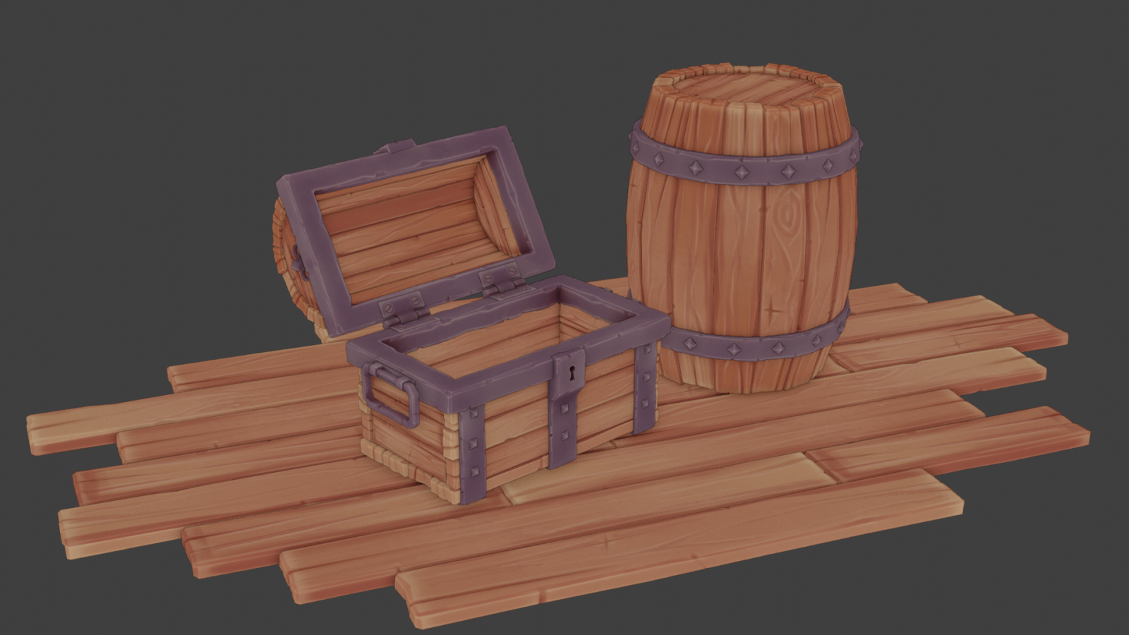 For the floor planks I used bottom and side planks of the chest, and for the barrel, I grab the lid of chest, used half of it to create 1/4 of the barrel circumference, and the side of the lid, to make the cap of the barrel.
