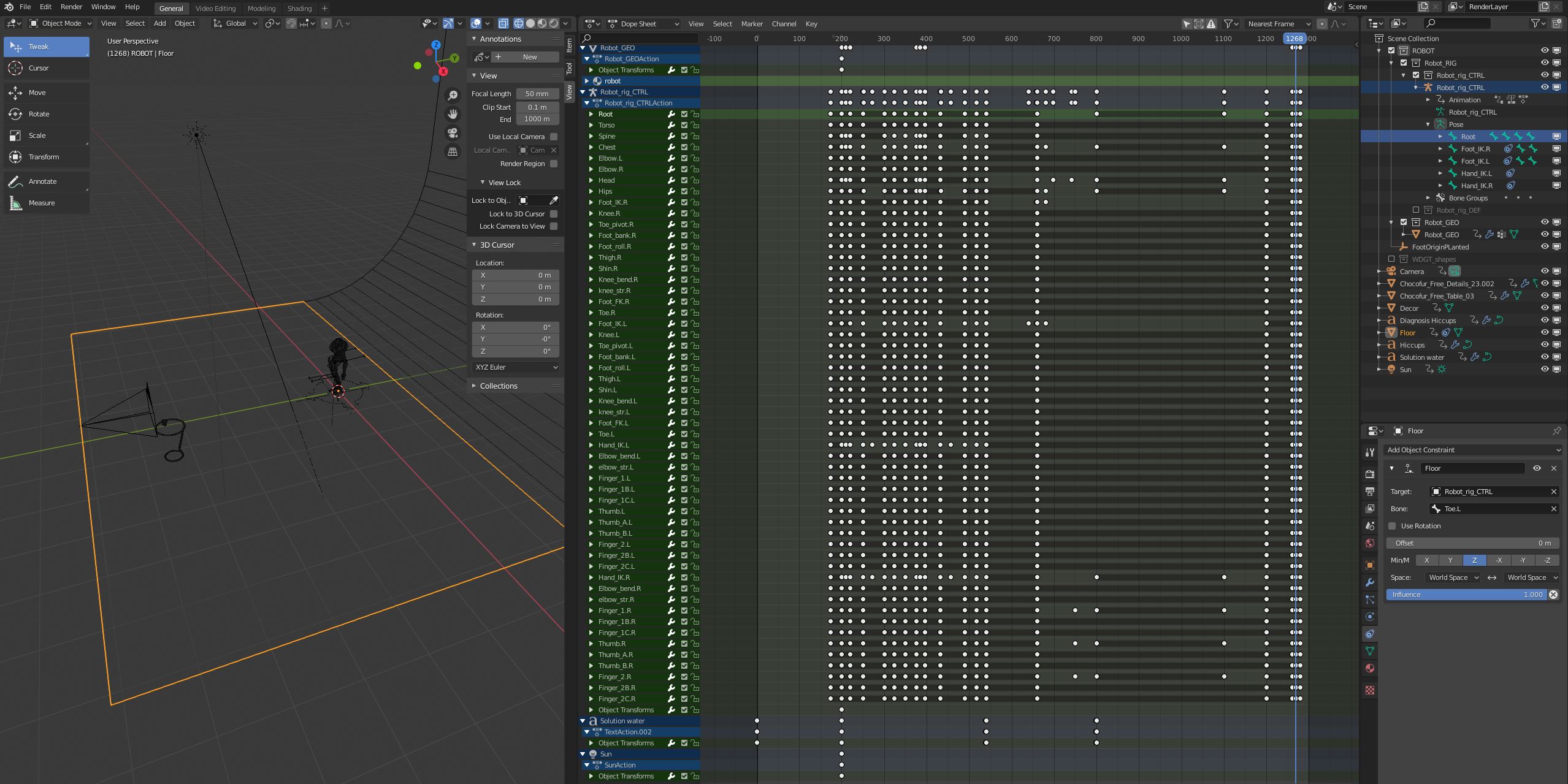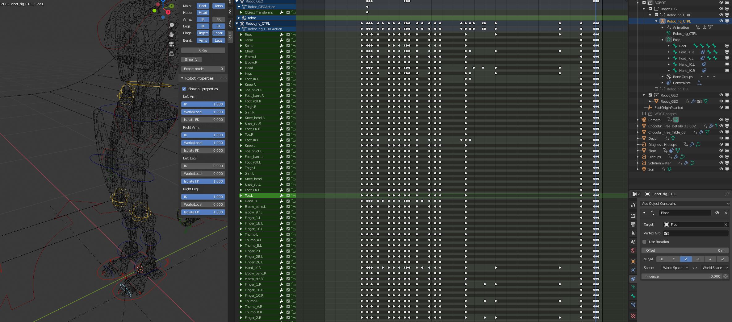 I have tried to add a "Floor" and tried to set it as an animated constrained to the Toe in the foot, but somehow fidling with all the FK and IK and World influences seemed to have 0 effect om the rig: the toe did not stay put on the floor whenever I tried moving the Robot_rig_CTRL