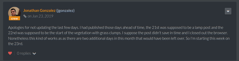 J Gonzales was away for a few days. The last week was supposed to start on June 22nd. For the 21st a Lamp post was originally planned.