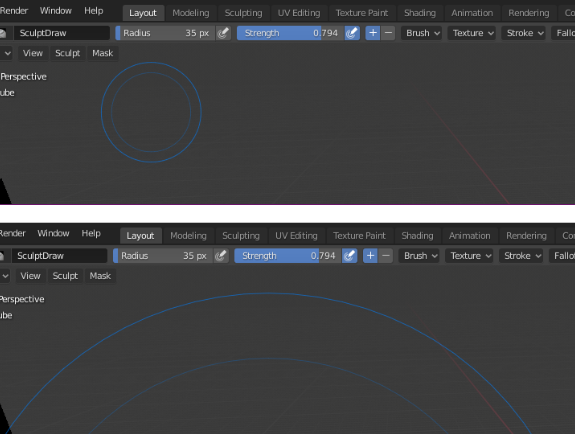I noticed that unlike in the video at 2:25, my brush radius slider was not updating when I used the "F" shortcut. It looks like you have to press w to bring up the context menu and disable "Unified radius"