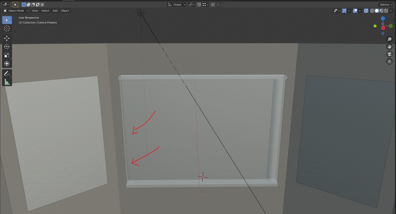 Hi, i have an issue with this part of windows. Why the part indicated with red arrow disappears in Object Mode... and in Edit mode appears with some invisible faces.