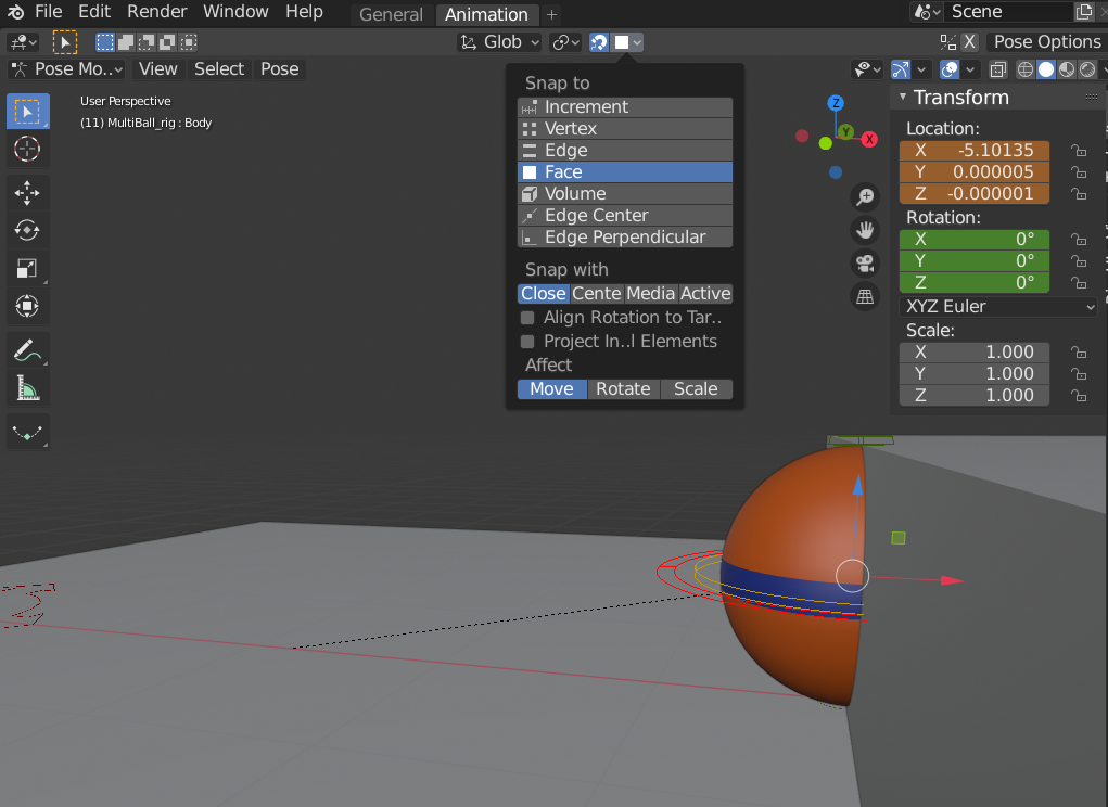 I'm trying to have the ball make contact with the wall. I want to do this precisely with snapping, but I can't figure out how. (If I check Project Individual Elements, the ball doesn't snap at all.)