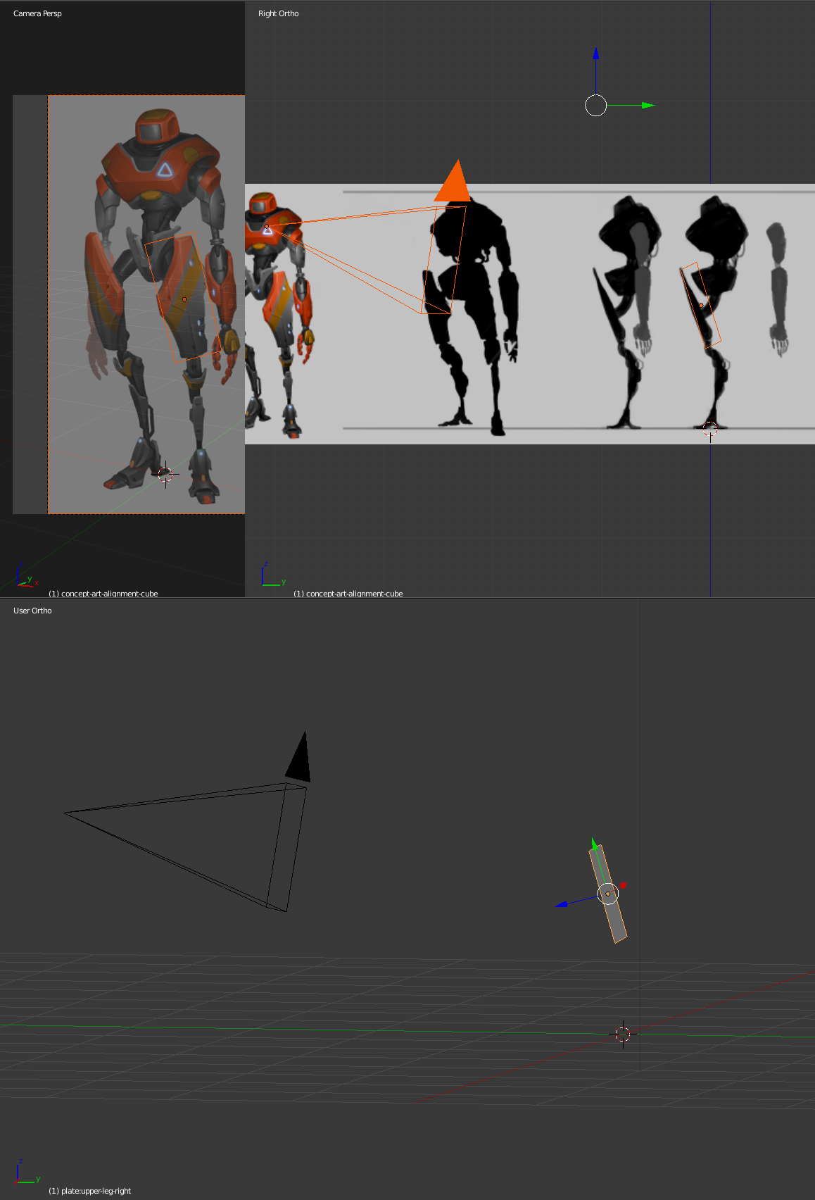I've followed your advice, Kent, to move the leg along the "View" z-axis in order to get the thighs approximatively aligned with the 3/4 view drawing and an active "Mirror Modifier". I've also readjusted the camera view a little bit with the camera locked to the view. The thigh inclination is directed downwards and follows that of the robot's right side (left image half), the inclination of the shin follows that of the 3/4 view robot's left leg (right image half) in order to get a more dynamic pose and avoid the right side orthographic view's leanback. If there're no major concerns from your side, Kent and Spikey, I'll continue now with the blocking of the leg behind the shields.