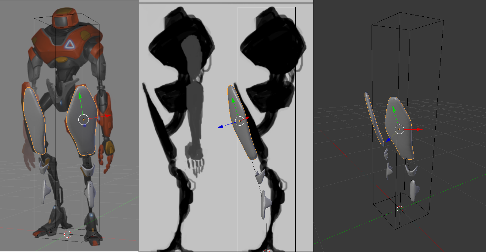 I focused on the 3/4 view and only took care that the parts aren't to much off in side view. Maybe I'll have to readjust it later in order to make the body mechanics work for animation. A run animation like in the Youtube trailer would be a great achivement for me!