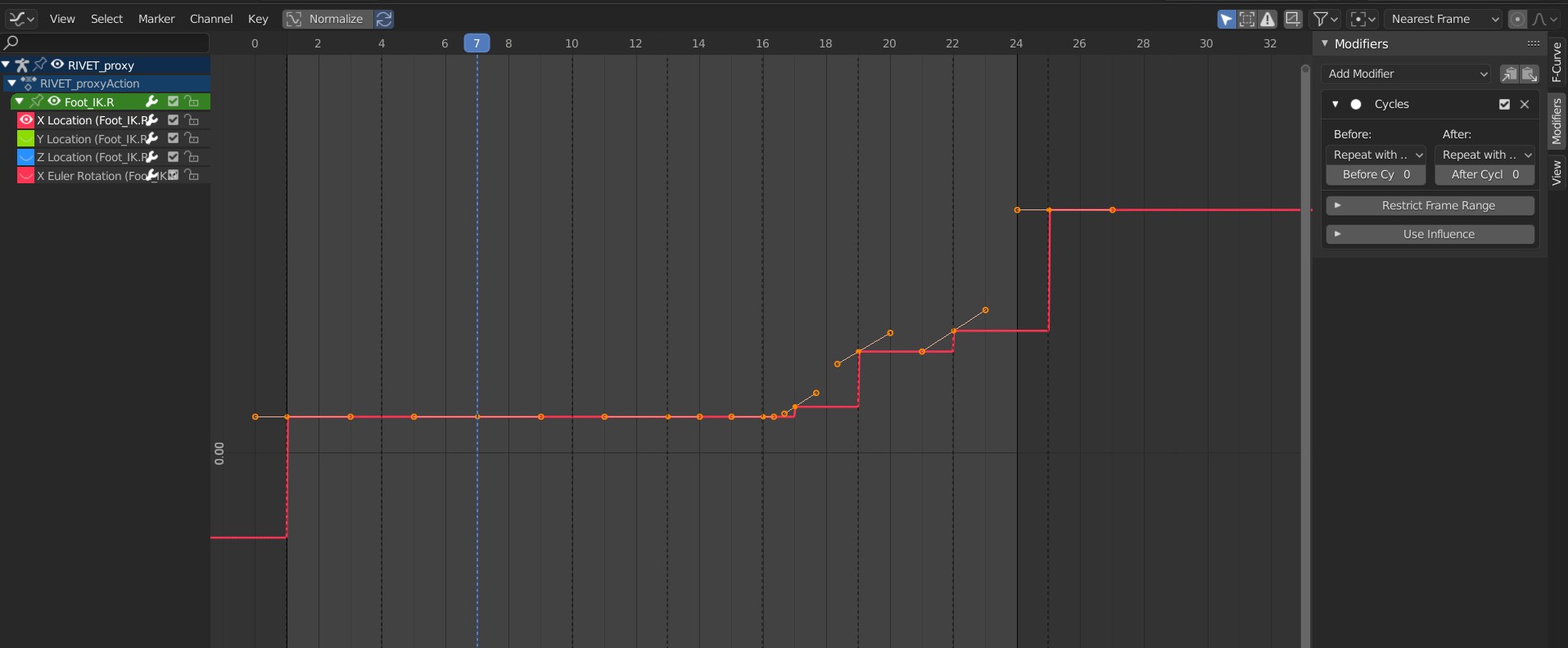 When I add cycle modifier to y location of the foot, it is showing ok (maintaining bazier shape of the curve). However, when i do similar to the x location the bazier shape of the curve turns to constant. What am i doing wrong here, please?