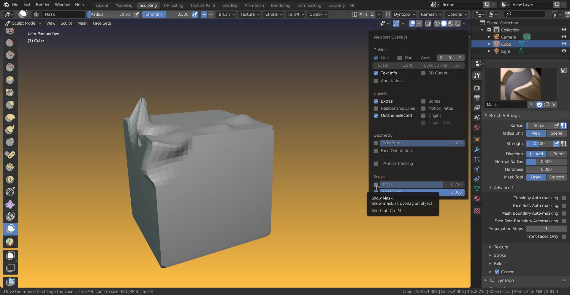 Now that I want to make the side fins, it does not paint black over the mesh. I've pressed ATL + M to remove any masking, but still cannot make any new mask.
