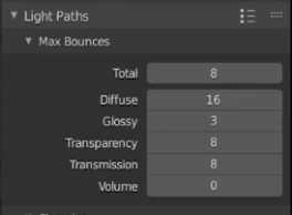 When you set the Transparency above to 16 Bounces there will be 16 (read 17), not 8 (read 9). Similar with the Volume.