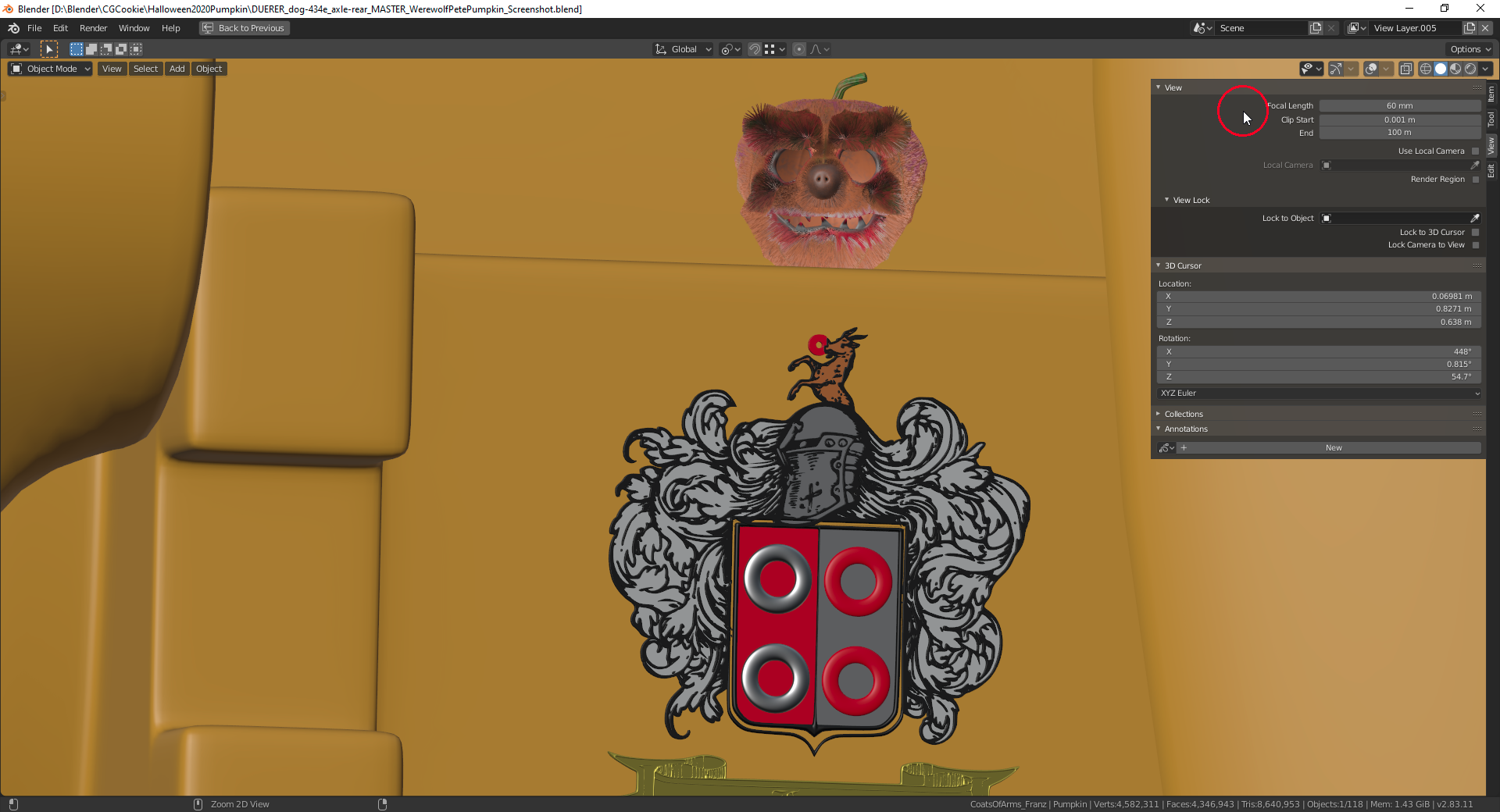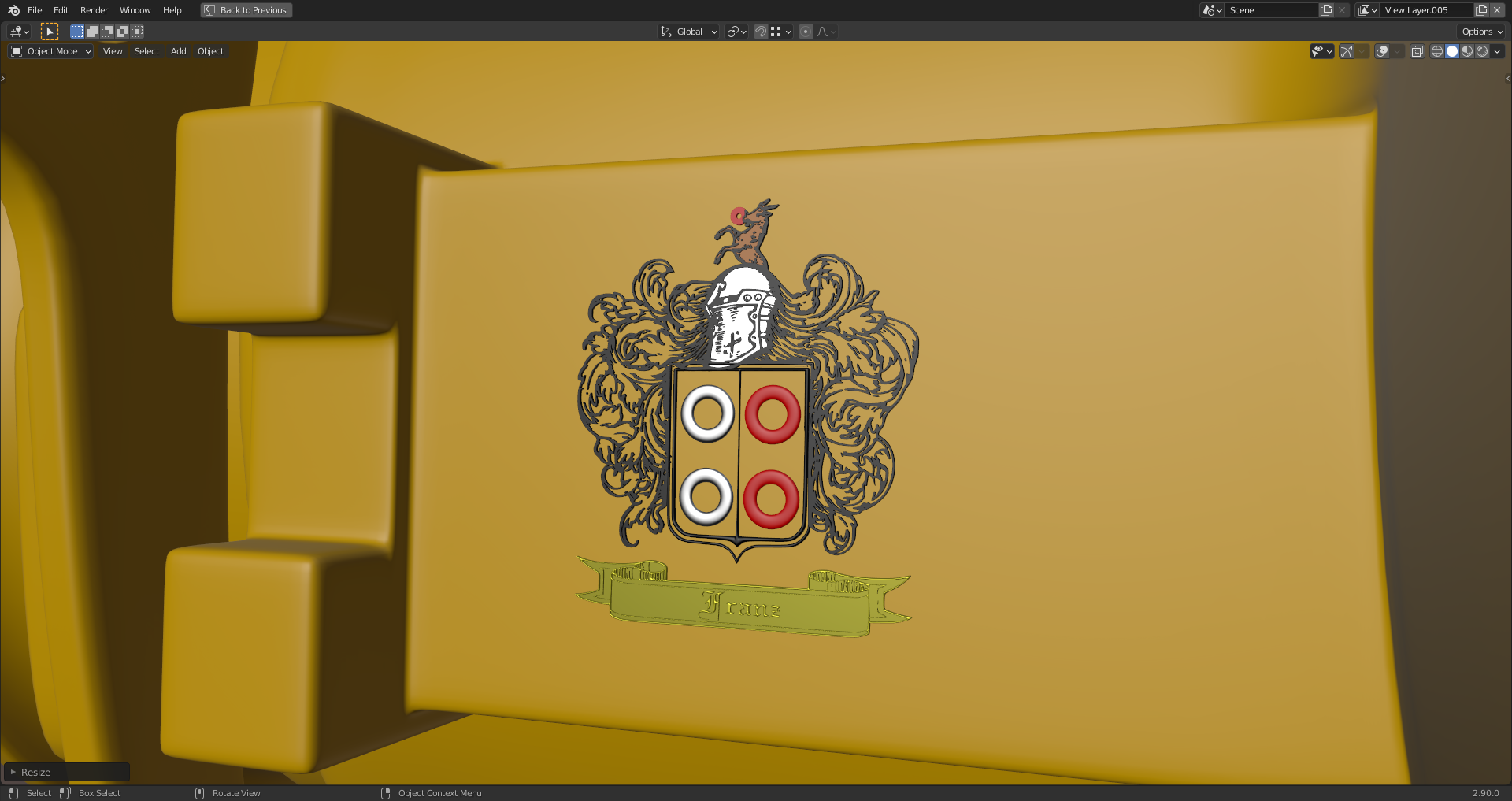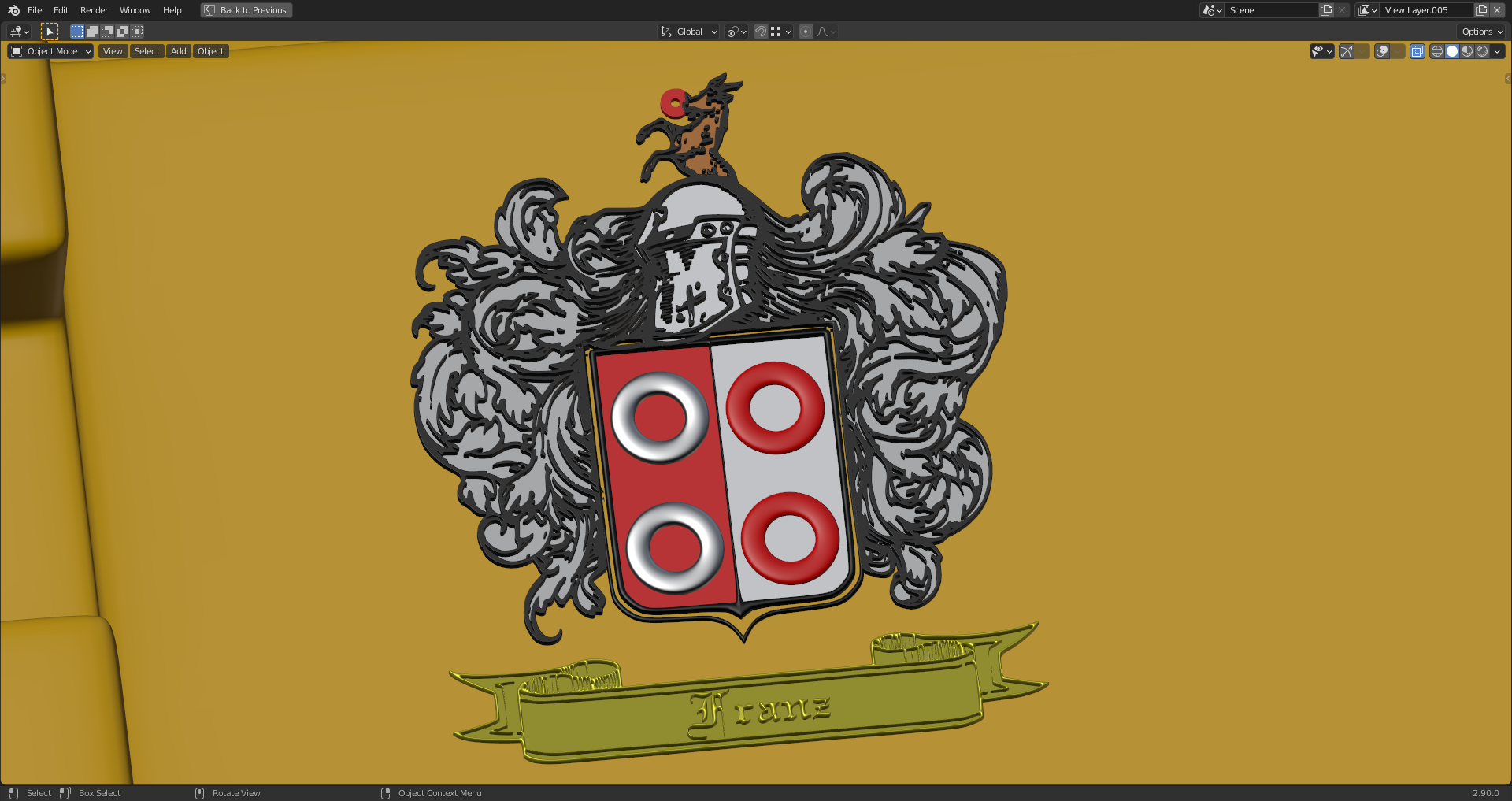 I've imported it as SVG file into Blender where I've extruded the curves for the feathers. The rings on the shield and the scroll with my family name are modeled as meshes, the scroll by conversion of the path into a mesh with some final editing (all quads for training purposes ๐).