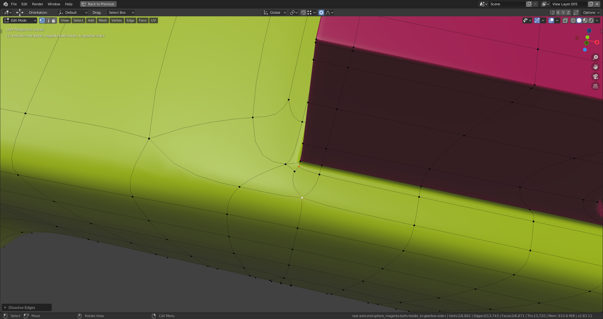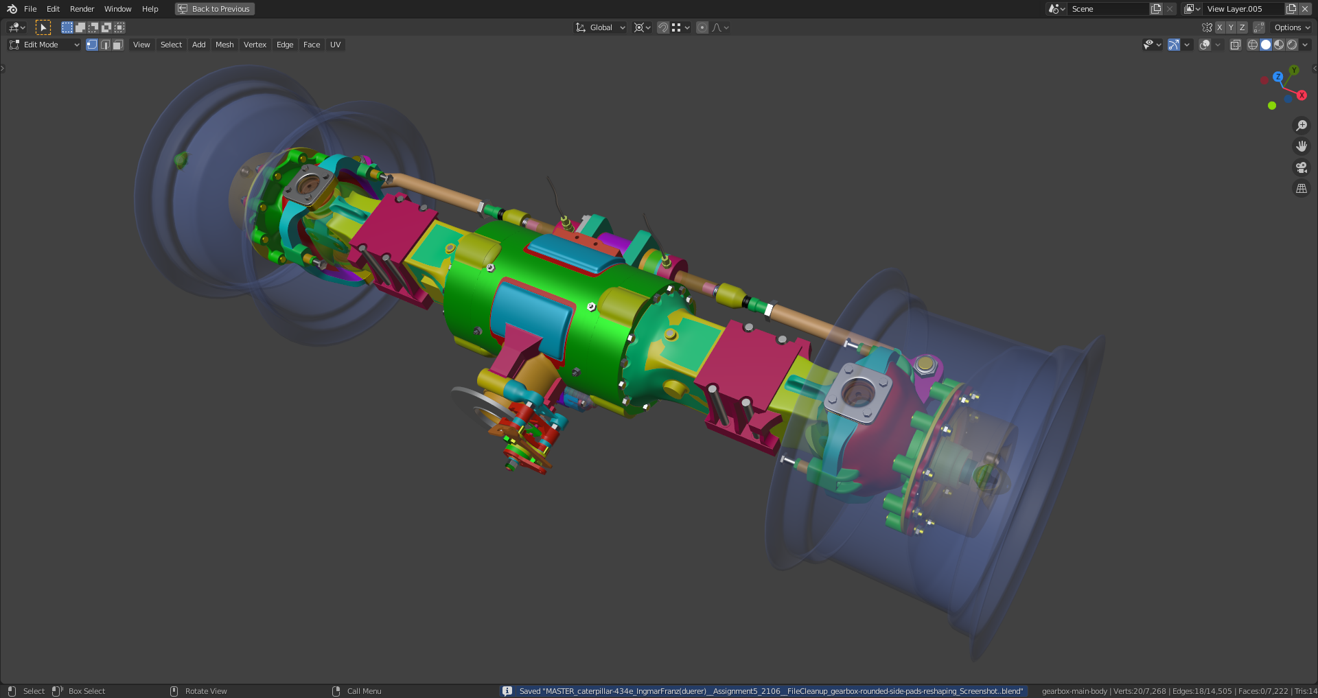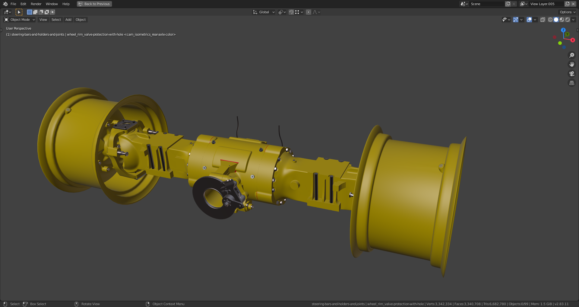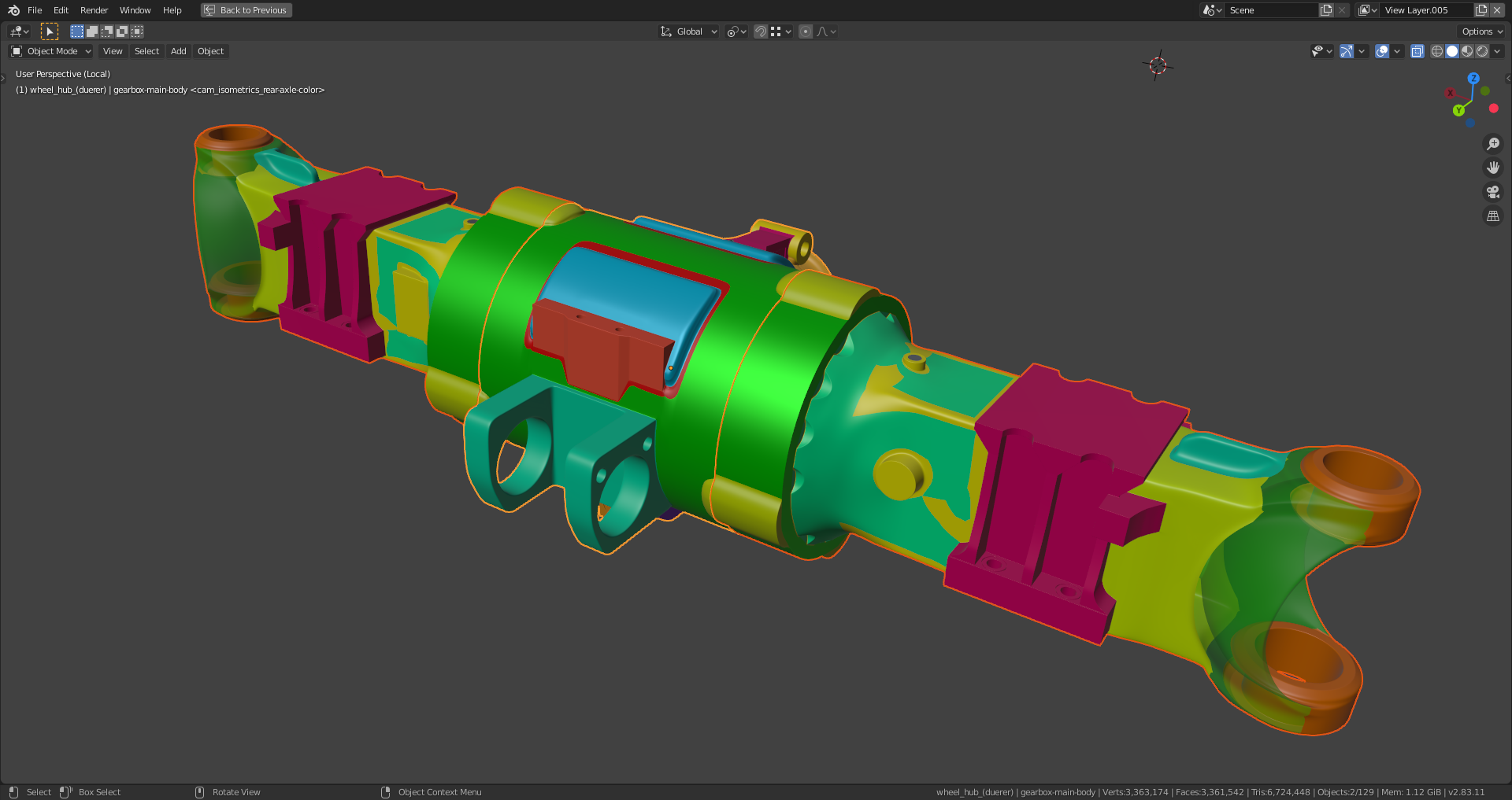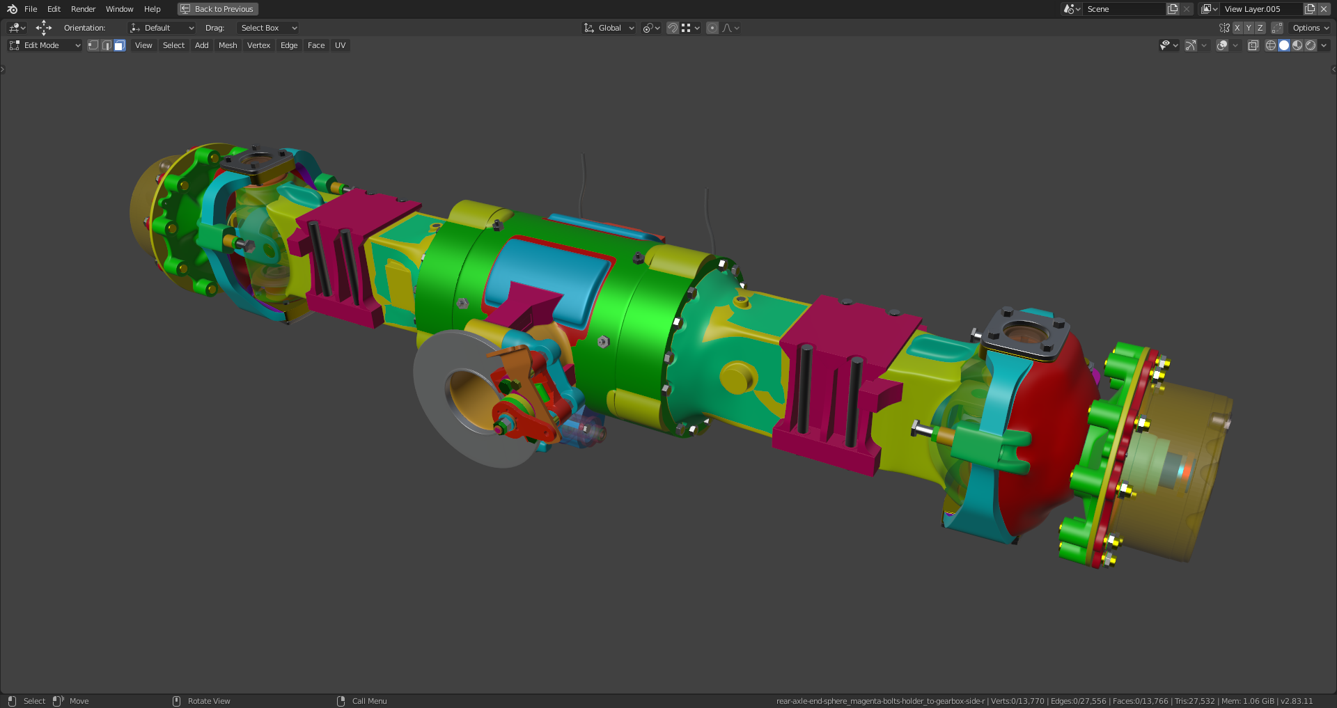 spikeyxxx, with the too sharp edges. This is bothering me, too. But it's relatively easy to fix. It's a remnant from the time when I used the "Bevel Modifier" with activated bevel clamping which was triggered very early by areas with extreme dense geometry. The main thing for me is that the rear axle fits into the chassis and the connections to the front are correct. With everything in place, the edges can be softened without causing any problems on the transitions from the rear axle to the adjacent parts.