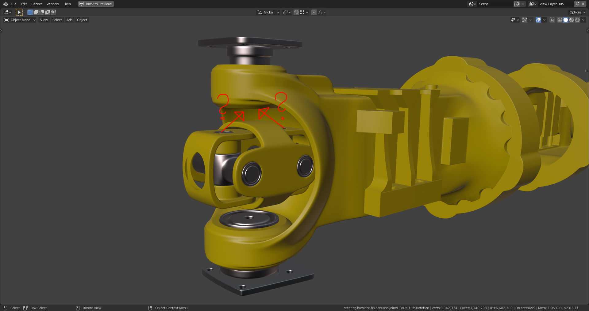 This is what I could do so far. I need some help for solving the shrinkwrap problems on the gearbox (marked in red) and the alignment of the yokes mentioned in the previous post.