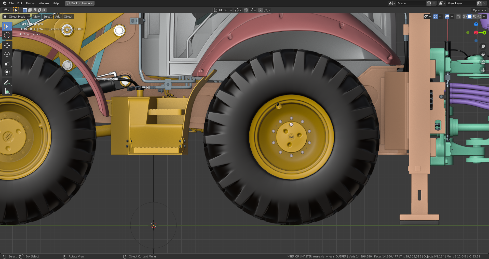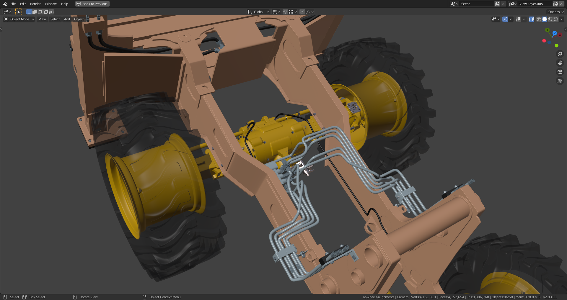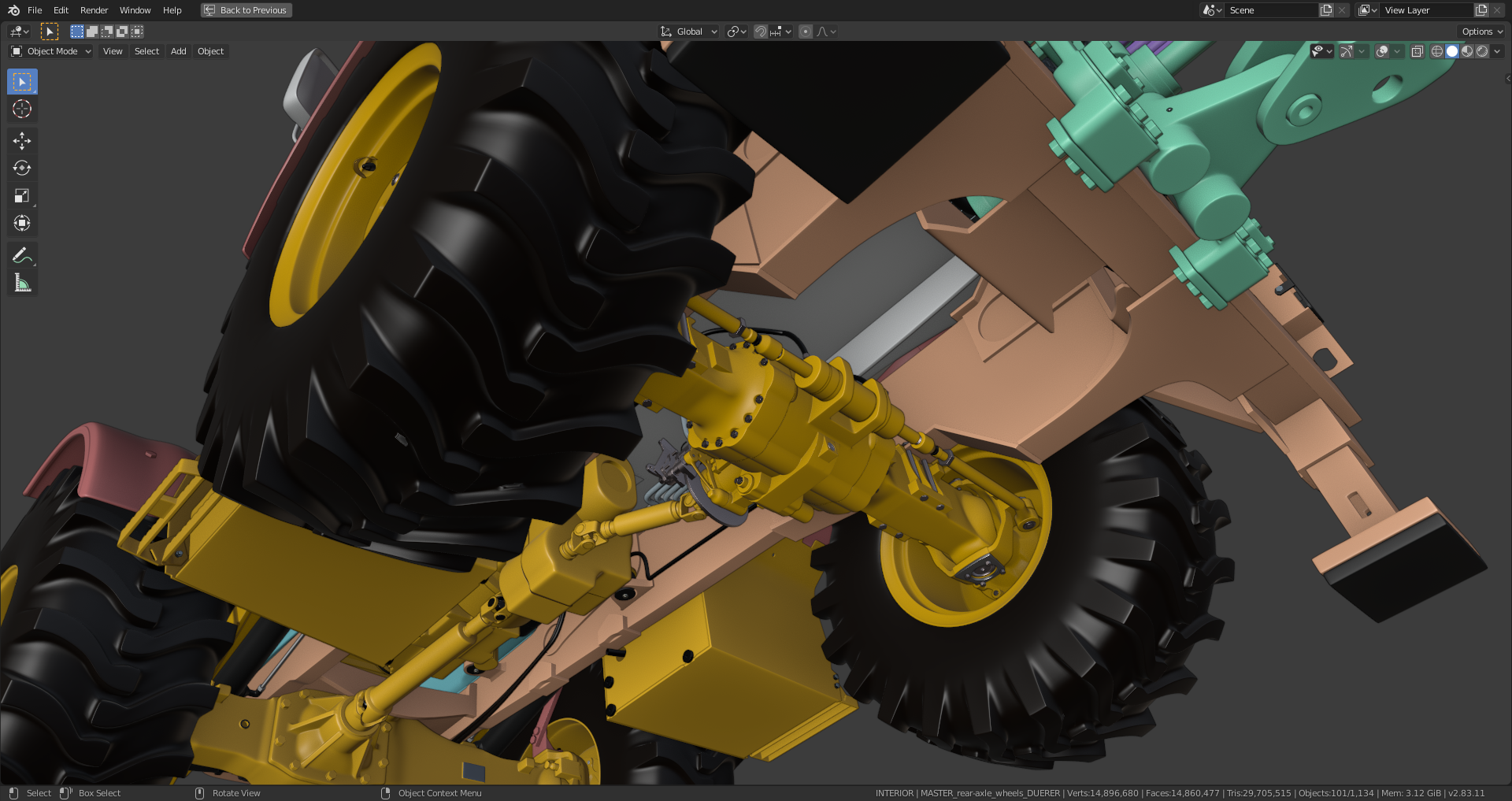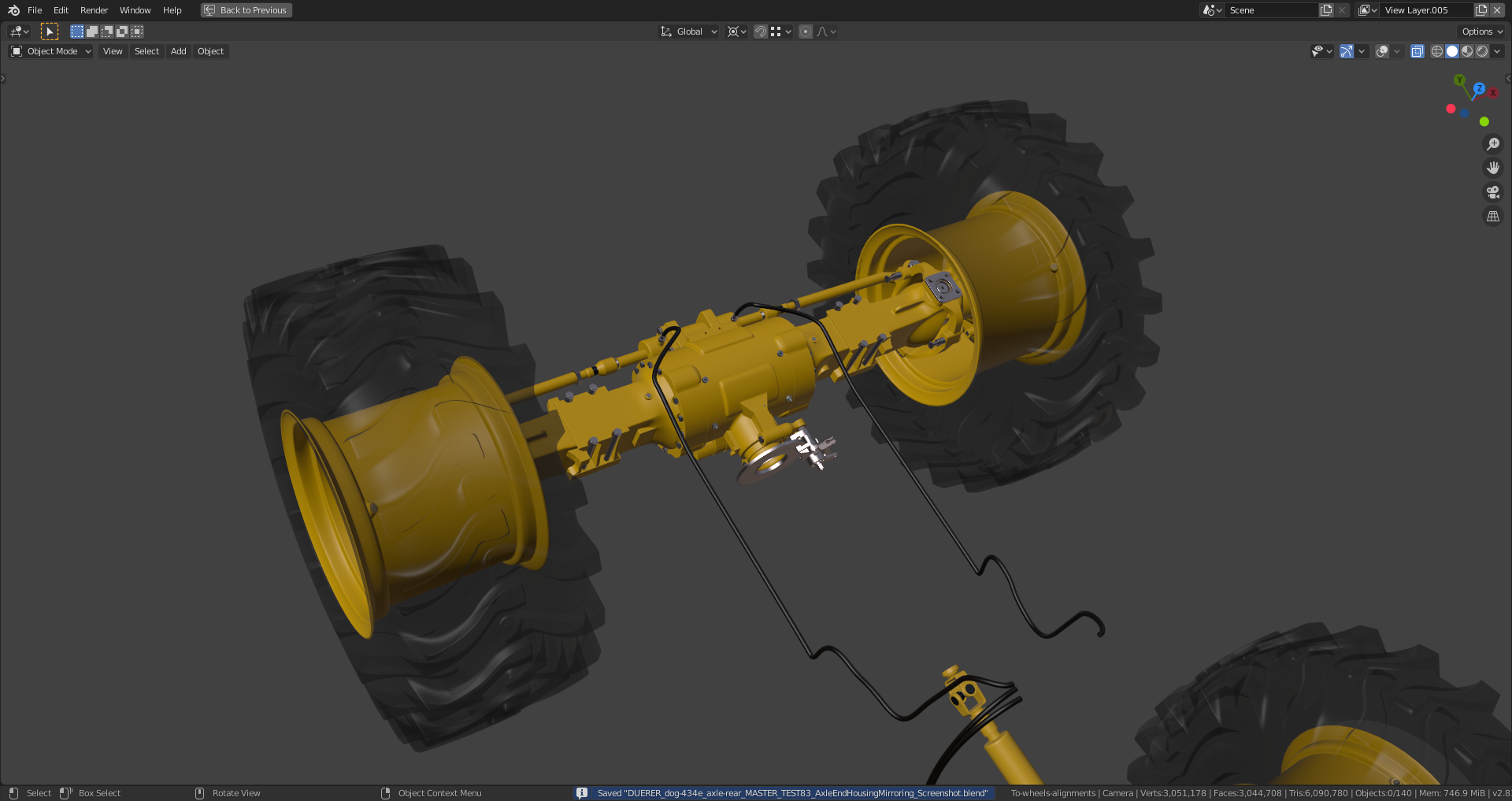 The "Shrinkwrap Modifier" on the gearbox still has to be applied which I haven't done yet because it needs the "Subsurf Modifier" beeing applied first in order to work properly which isn't a good idea as long as you're still editing your mesh. As far as I can see it now, the rear axle is now complete and ready for texturing (scratches, mud, rost etc.) and rigging. Maybe the hydraulic lines still need some adjustment and "hooks" for their attachment since they're currently floating in the air, but @adrian2301, you can certainly judge this better than me.