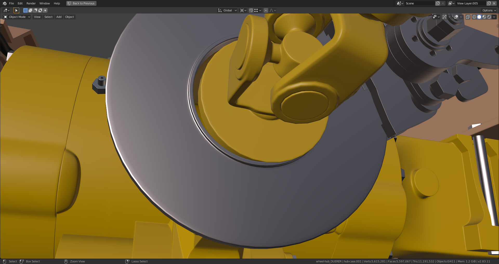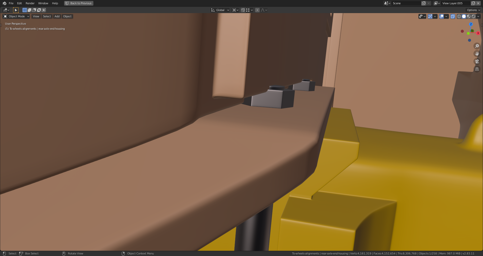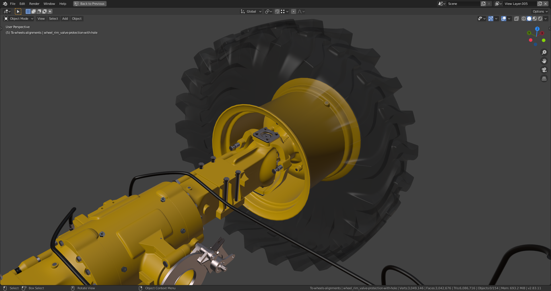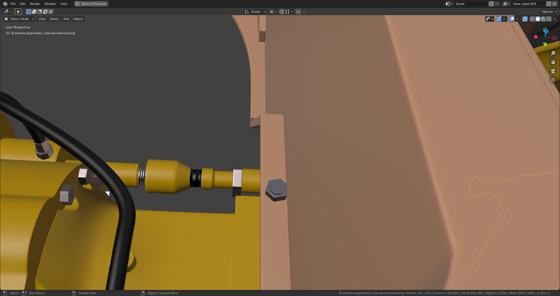 The "Shrinkwrap Modifier" on the gearbox still has to be applied which I haven't done yet because it needs the "Subsurf Modifier" beeing applied first in order to work properly which isn't a good idea as long as you're still editing your mesh. As far as I can see it now, the rear axle is now complete and ready for texturing (scratches, mud, rost etc.) and rigging. Maybe the hydraulic lines still need some adjustment and "hooks" for their attachment since they're currently floating in the air, but @adrian2301, you can certainly judge this better than me.