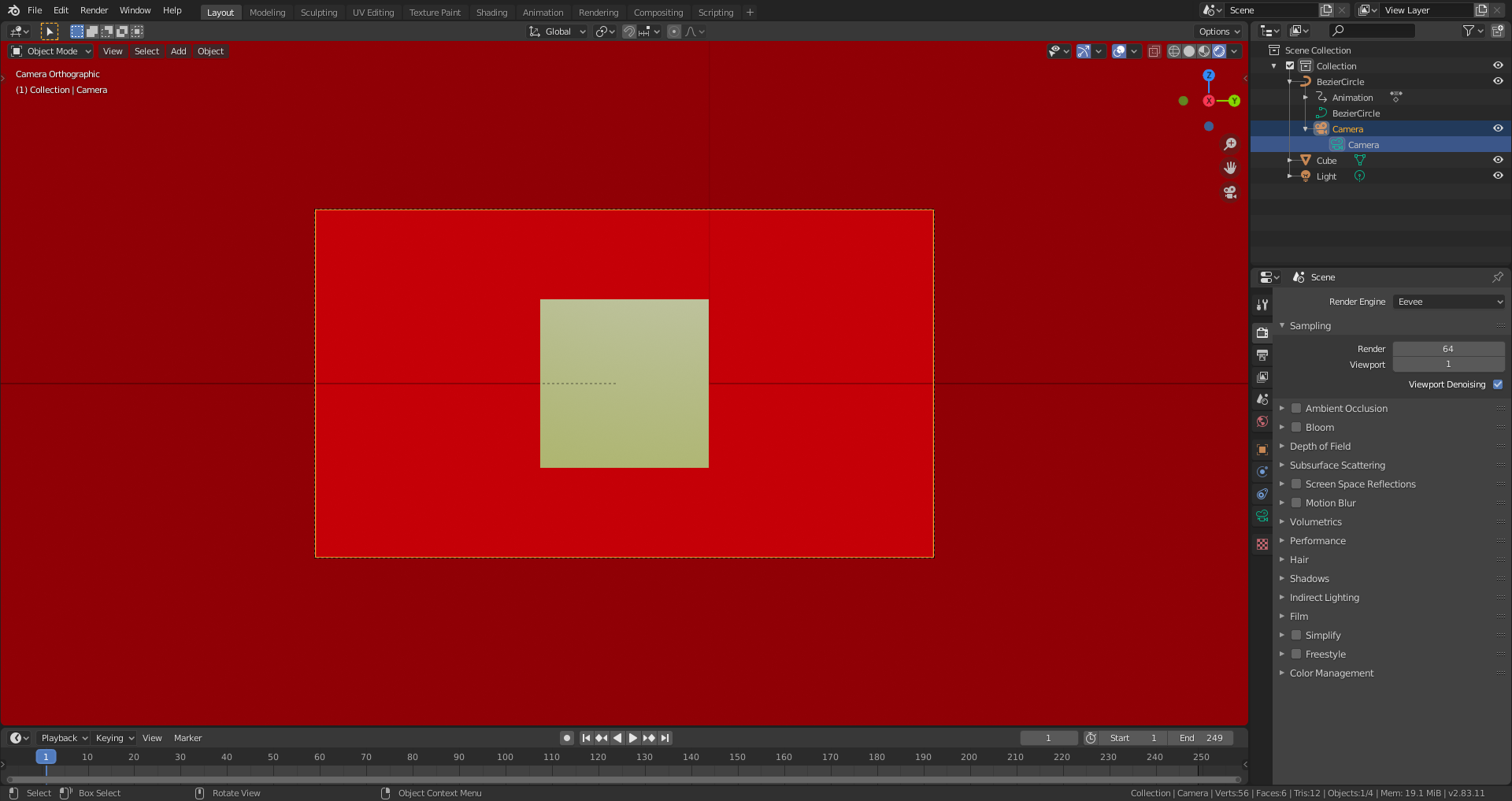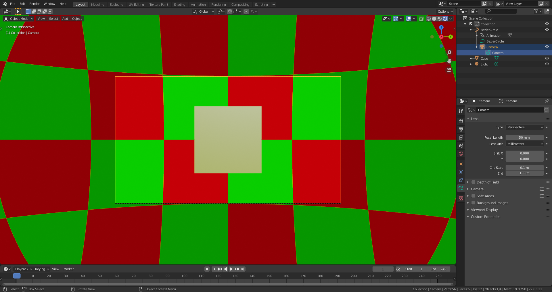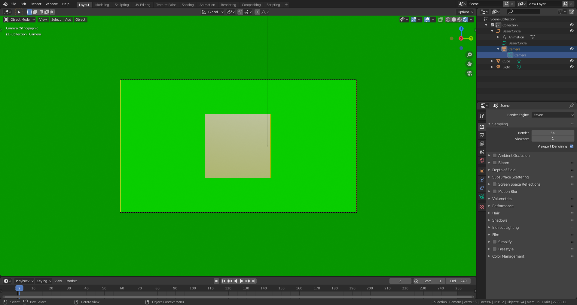 I've created an example file with a camera rotating around a cube (250 frames for one rotation but clipped to 249 frames for a smooth loop animation). The background is a green-red checker pattern and EEVEE is the render engine: