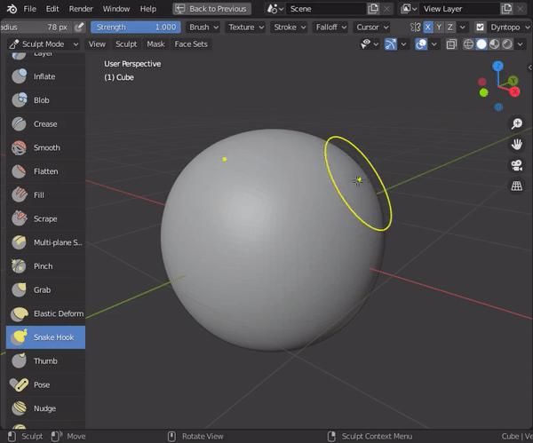 At 5:33 he rotates the snout as he finishes extruding it with the snake hook brush.  Whenever I try that, it looks like this: